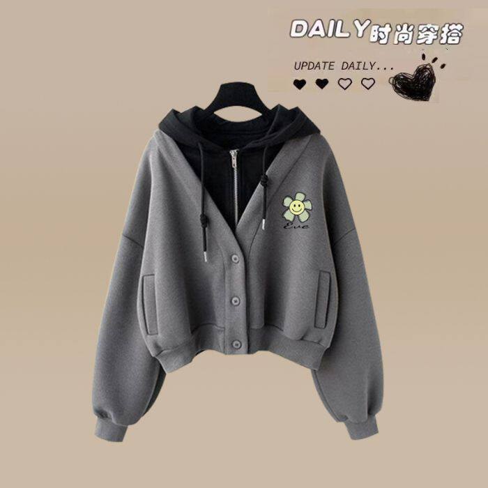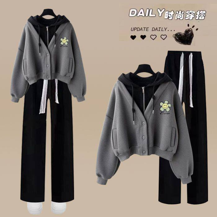 学院风休闲运动套装 少女春秋初中学生假两件连帽卫衣阔腿裤 两件套