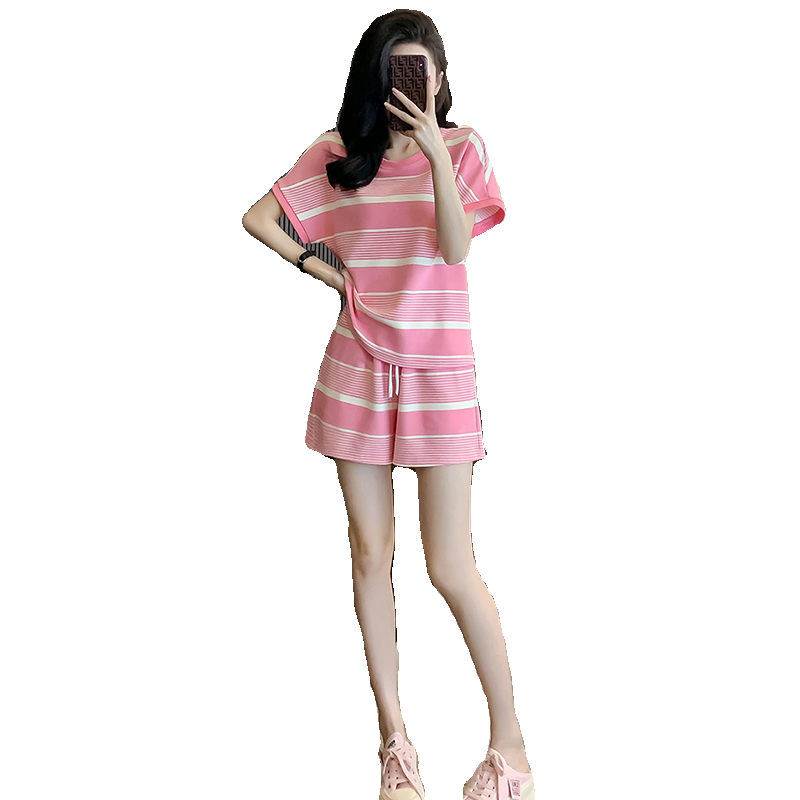 洋气两件套 网红炸街运动休闲套装 减龄条纹短袖 女夏季 短裤 宽松时尚