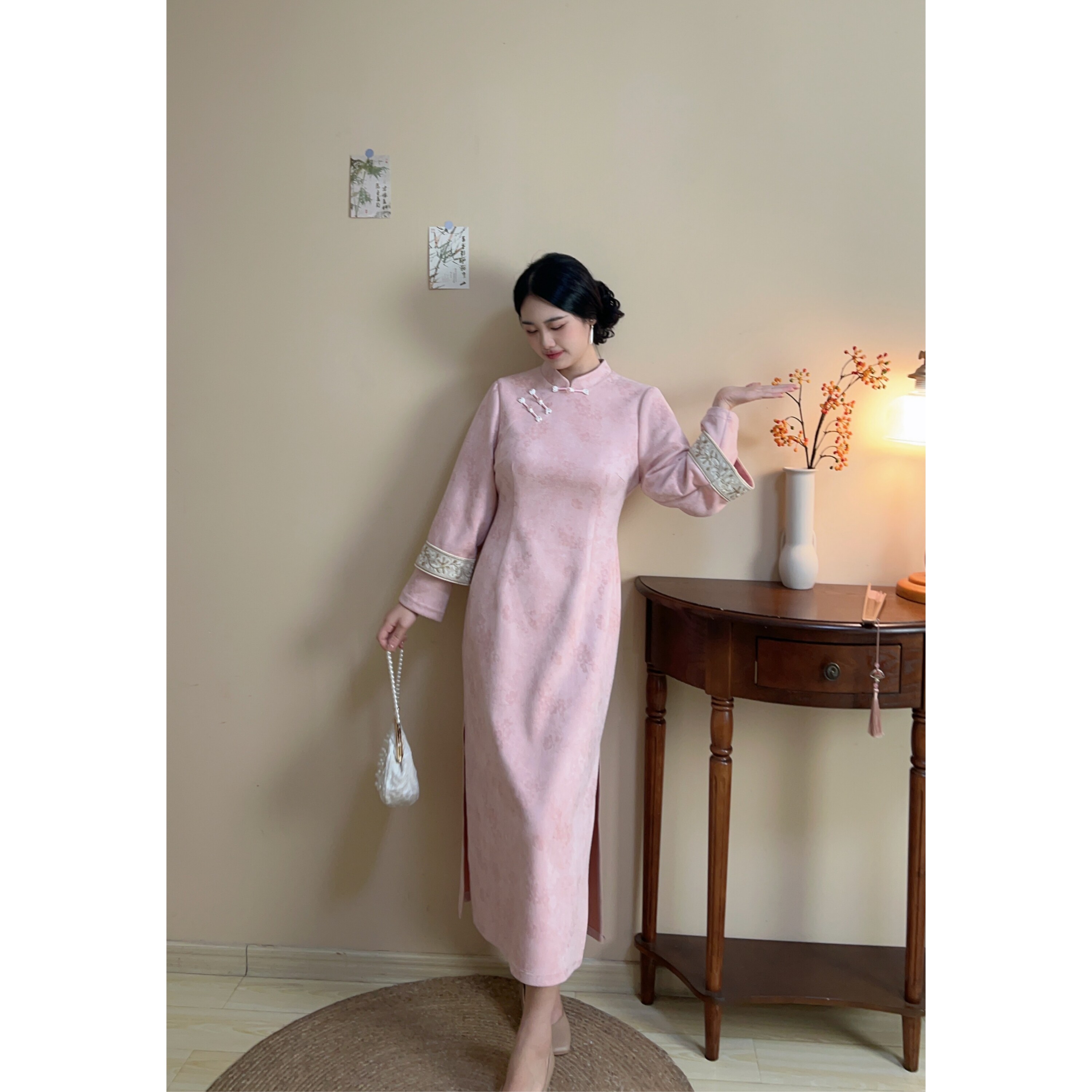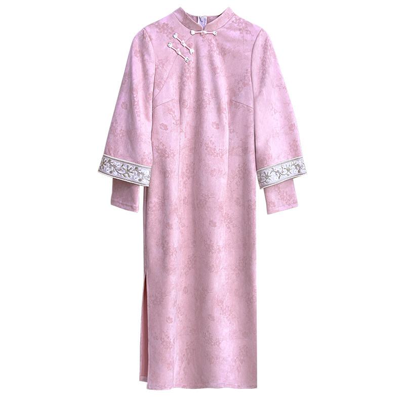旗袍连衣裙温柔气质秋冬 粉色麂皮绒大码 自制款 胖mm年轻款 桃烟