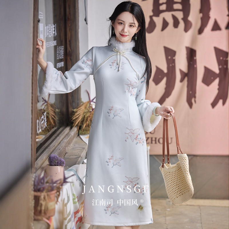 长袖 加绒蝴蝶钉珠淡蓝色冬季 倒大袖 修身 江南司造 日常 旗袍新中式