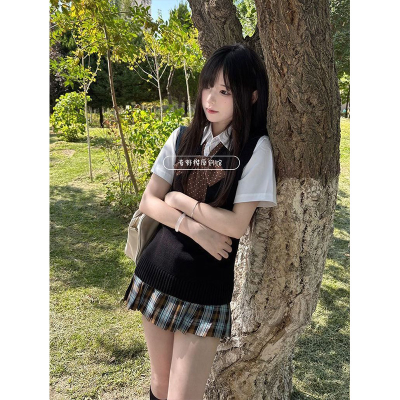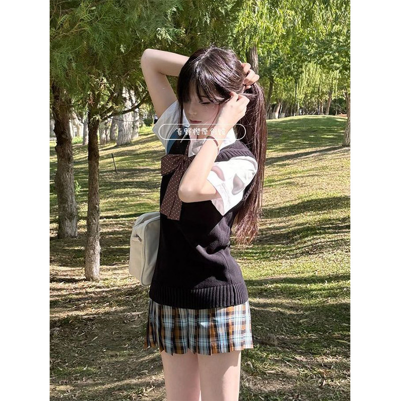 宽松衬衫 短袖 叠穿背心校供感学院风小众秋刀鱼格裙套装 原创基础款