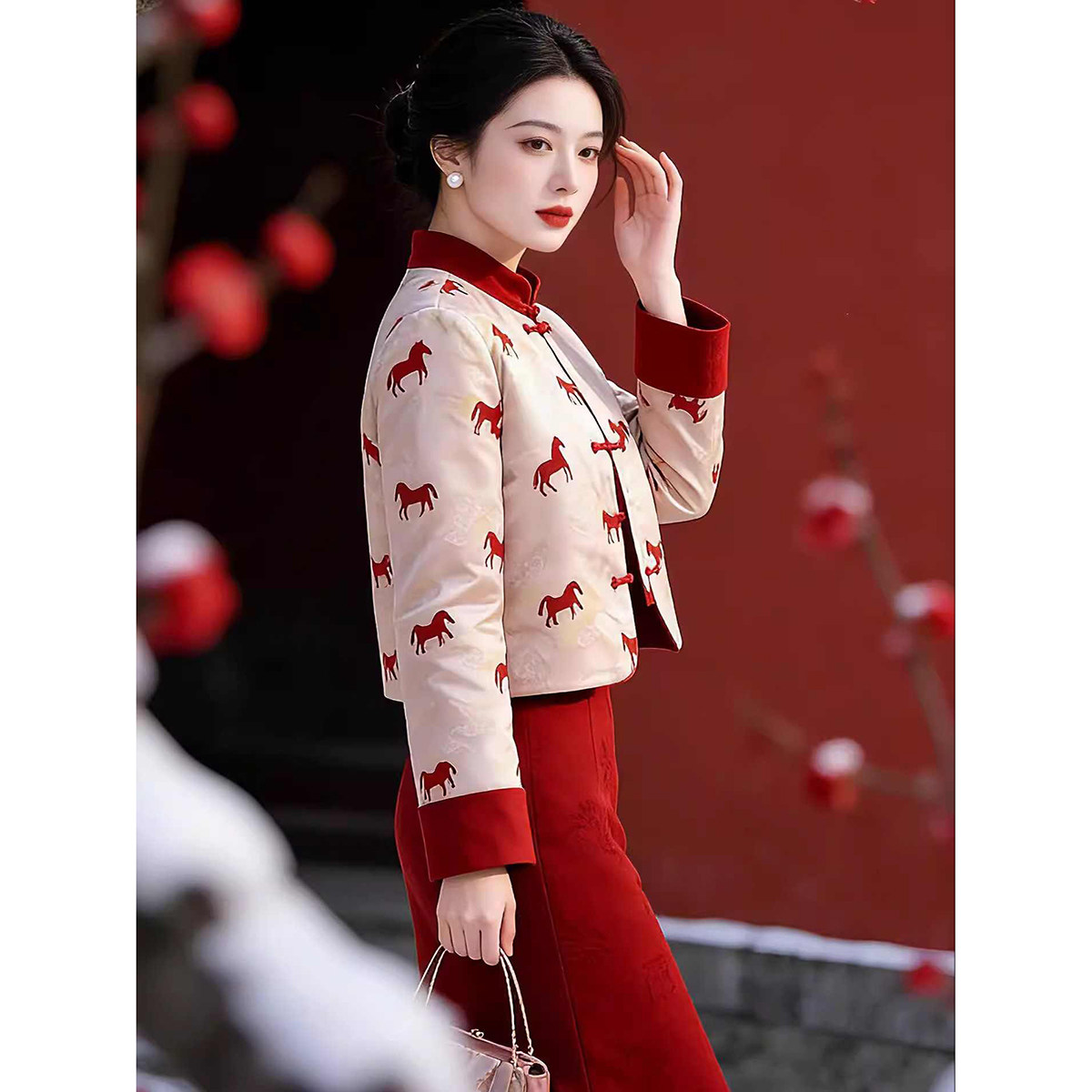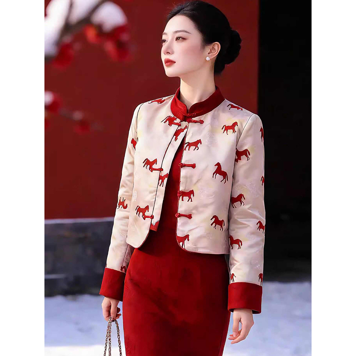 红色旗袍外套订婚结婚新年服套装 撞色套装 放马川 女冬季 新中式