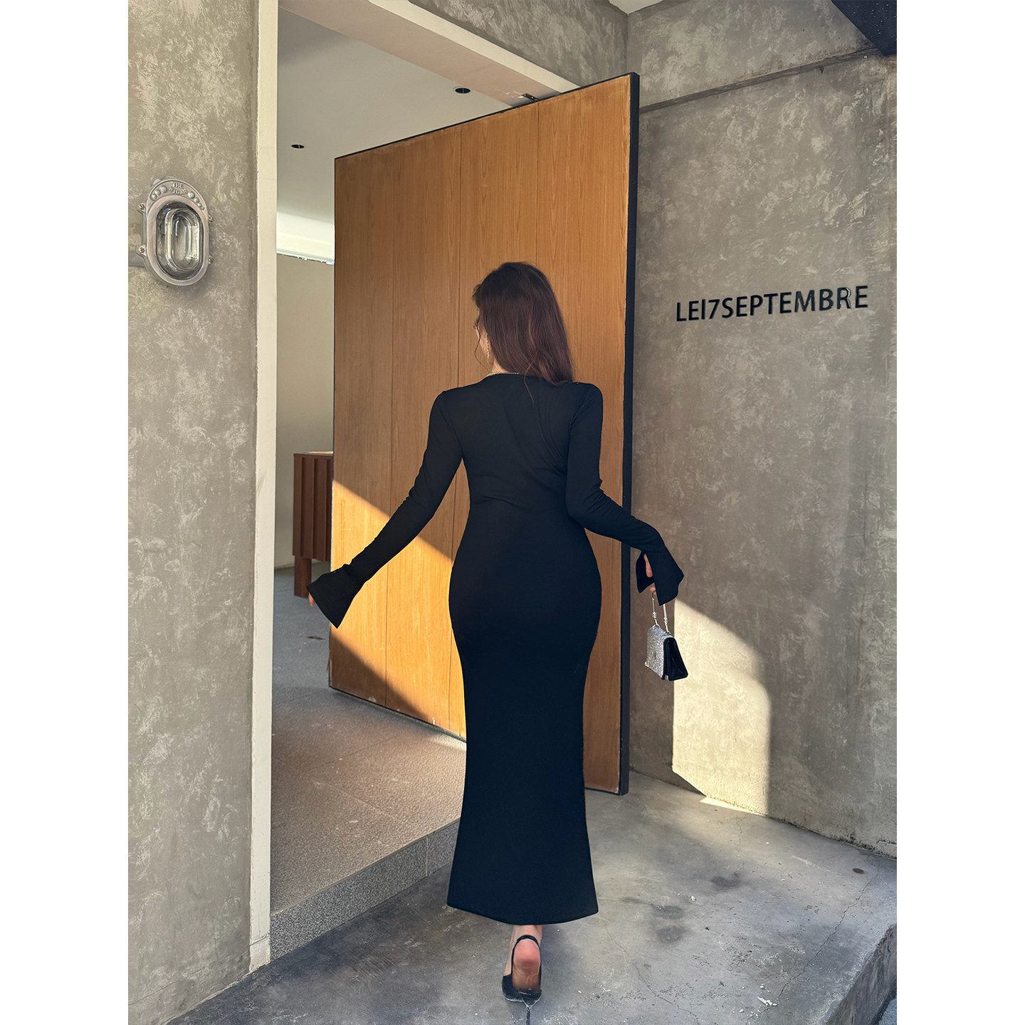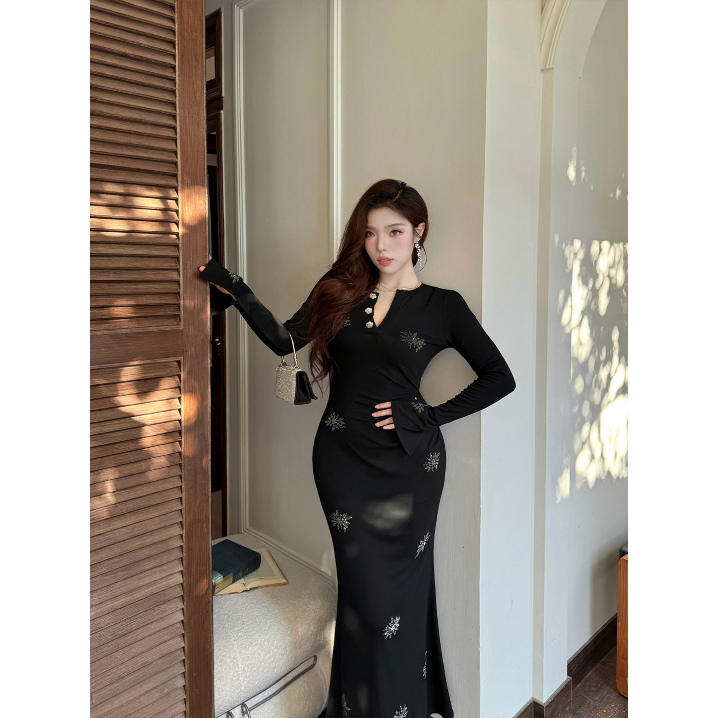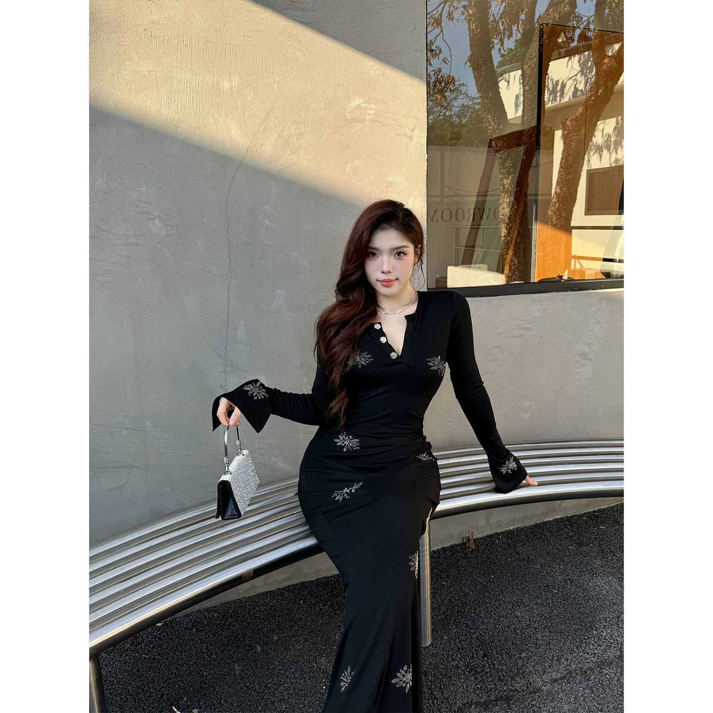 法式 大码 闪闪格调 高级花朵烫钻长袖 高腰包臀长裙秋冬 babes