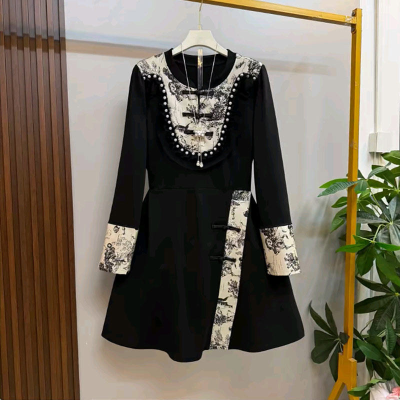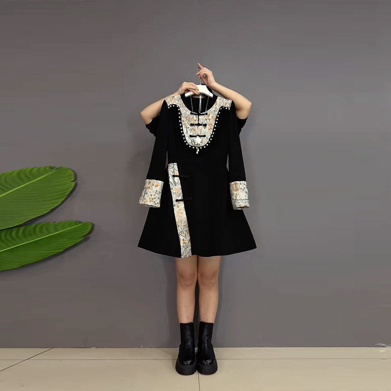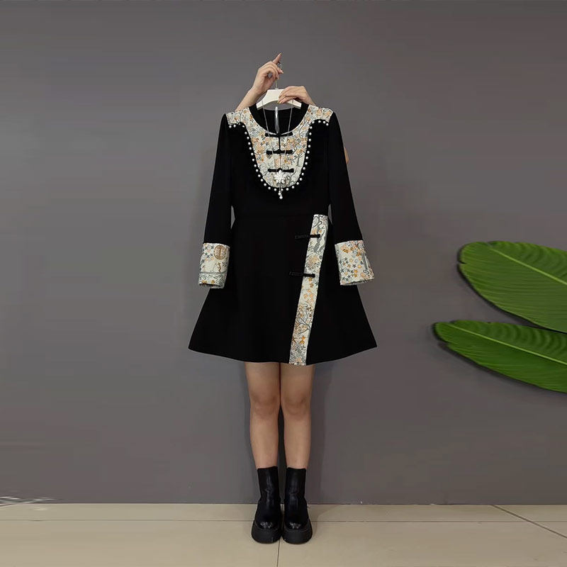 显瘦裙子 女装 连衣裙复古风大码 中长款 胖MM加肥拼色花朵盘扣领长袖