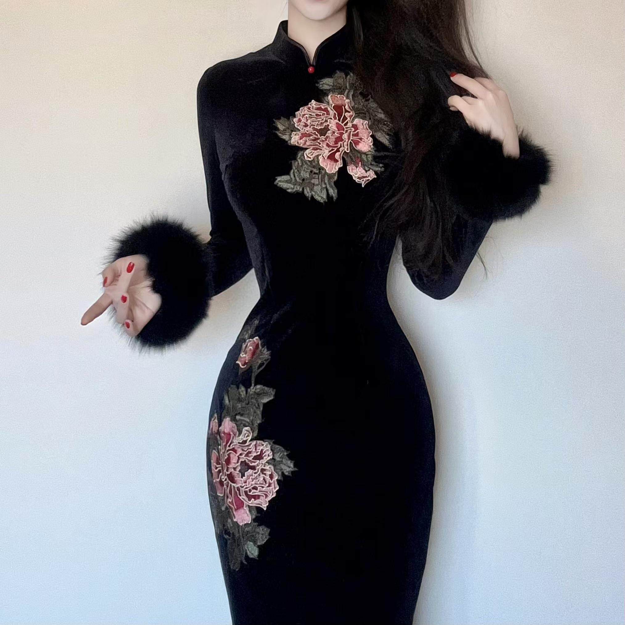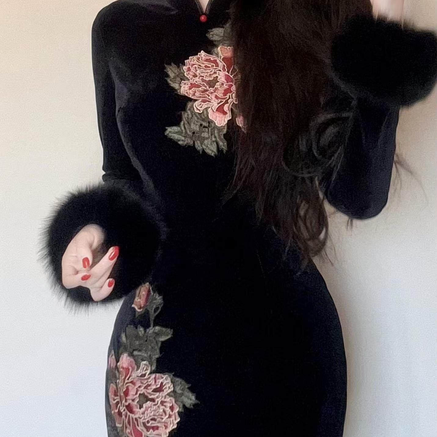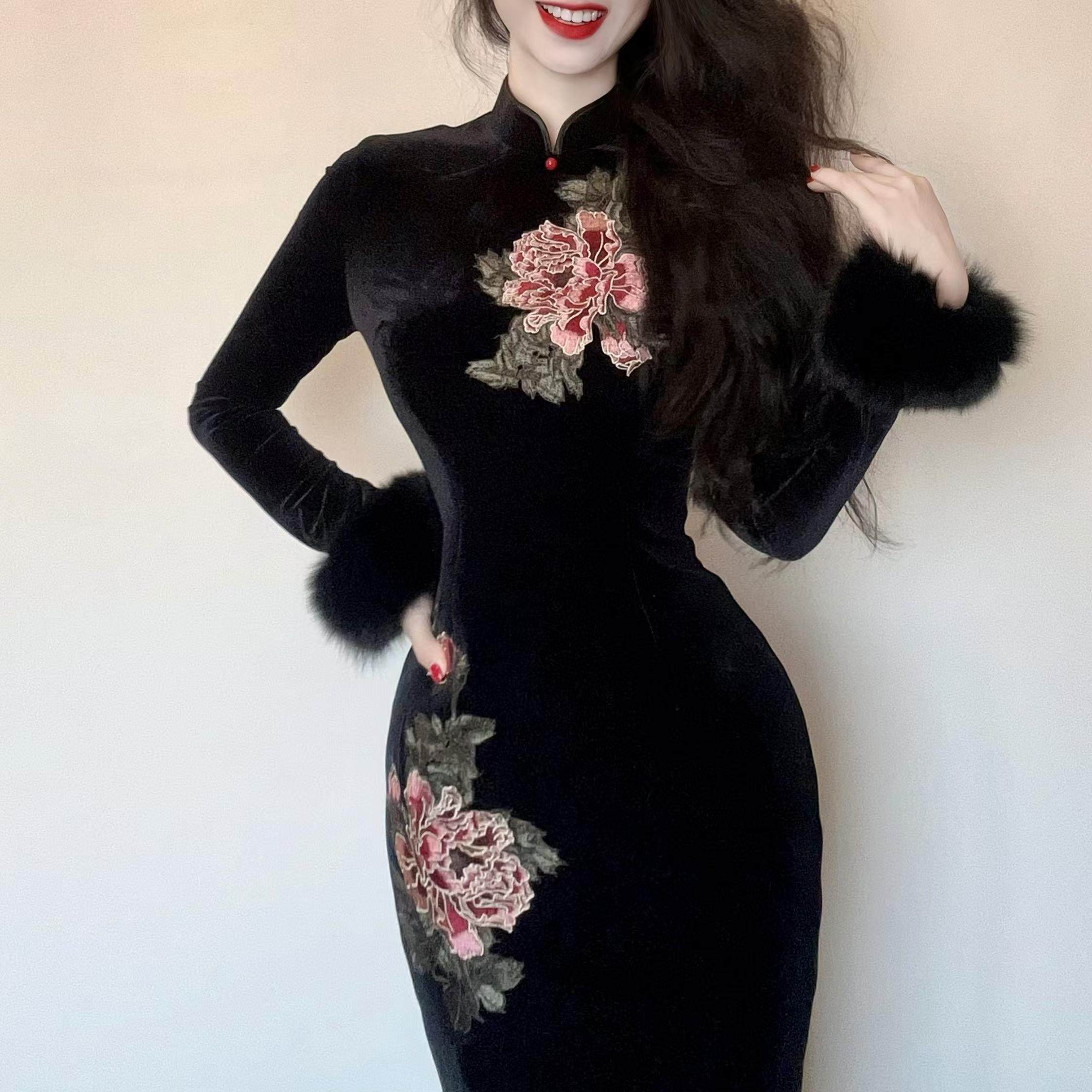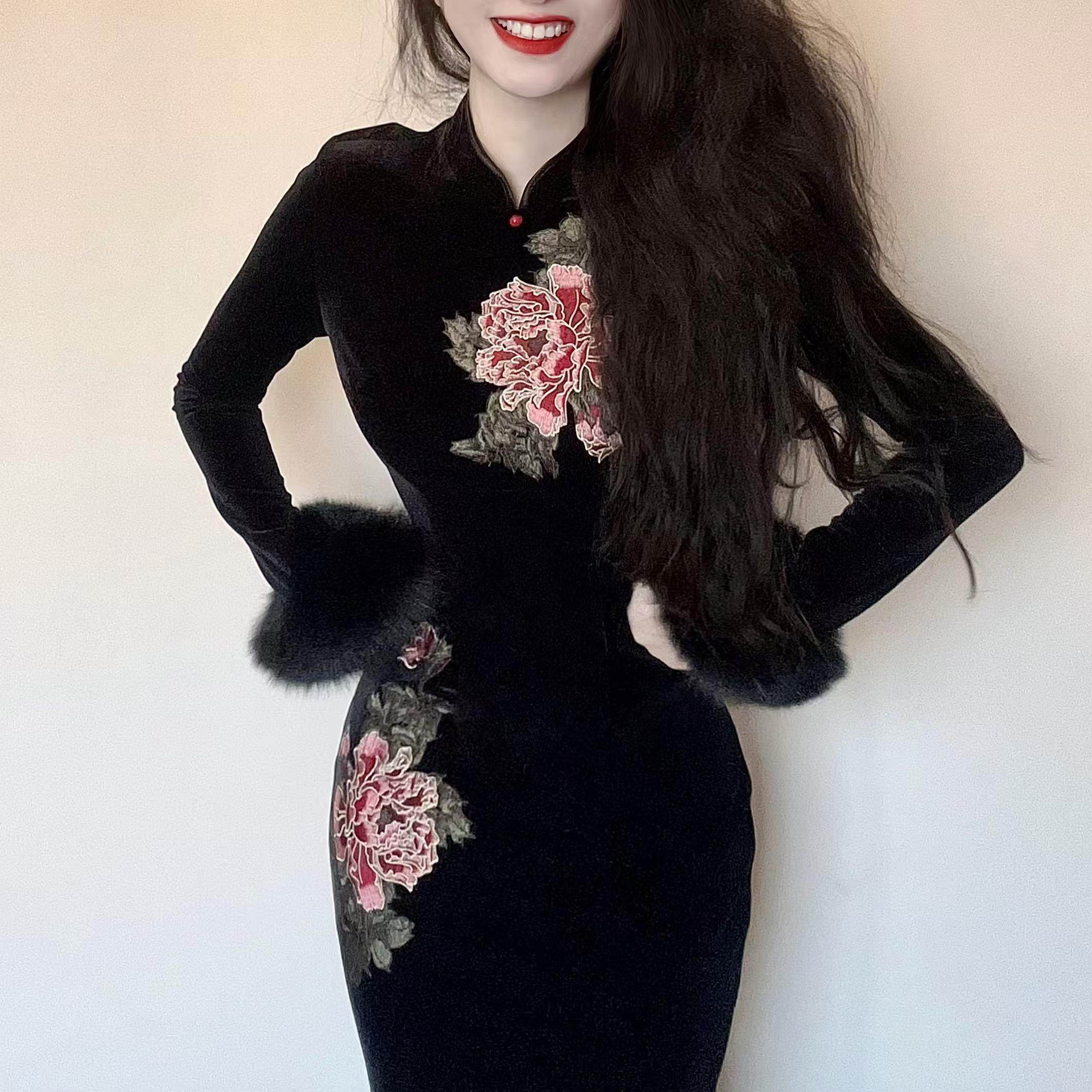LHMknk1画报夫人原创自制新中式 定位刺绣丝绒旗袍长袖 金笔牡丹