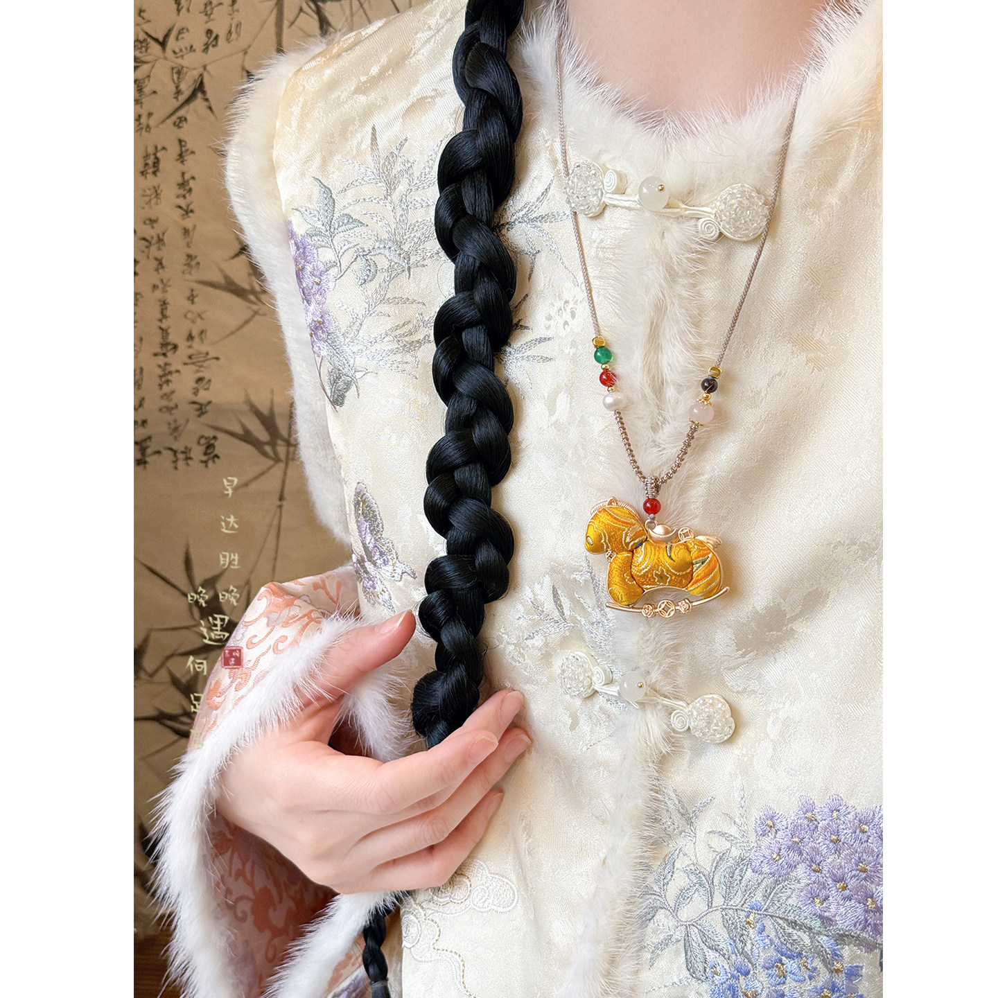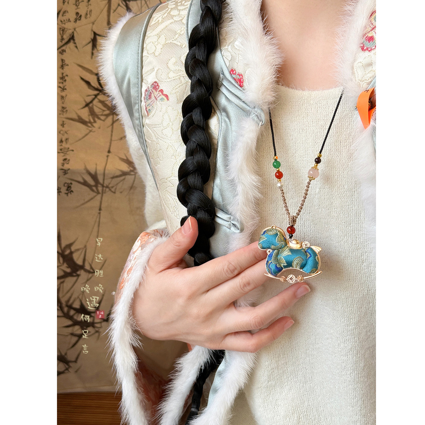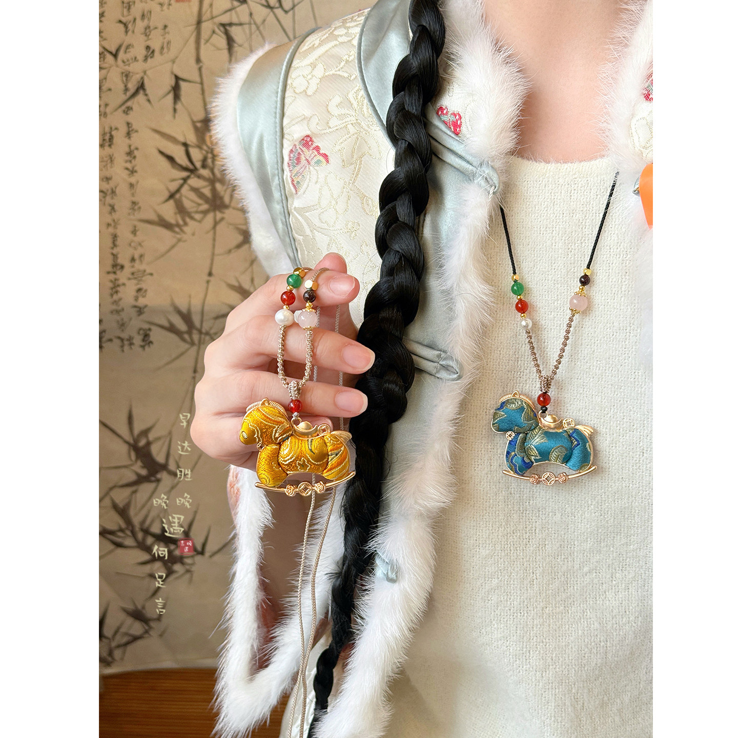 「颈上丹青」双面宋锦小马吊坠项链女款 国风毛衣链挂绳配饰 新中式