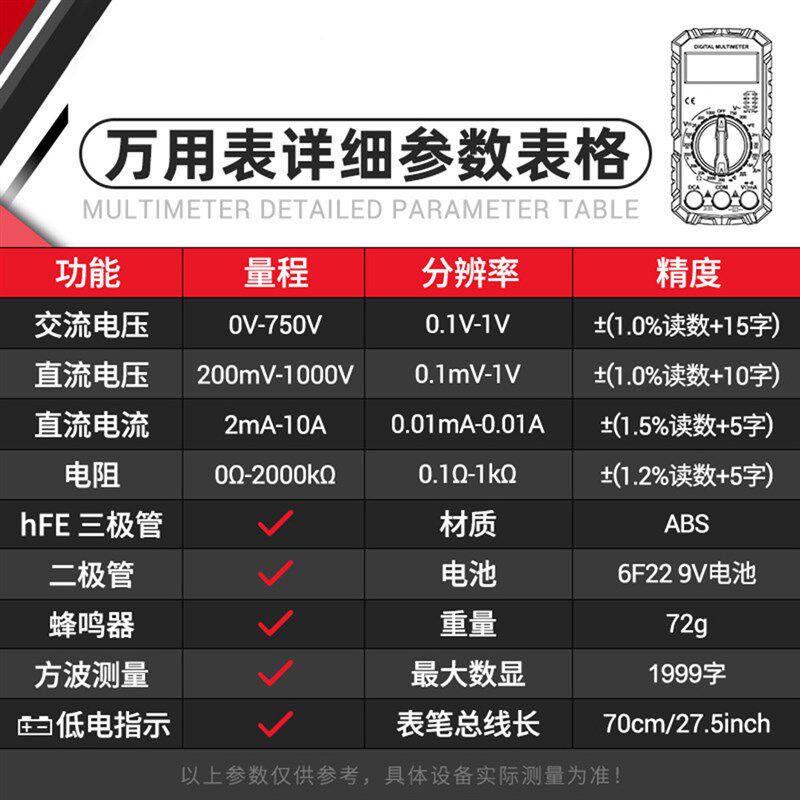 去购买>> 下架了的话点我重新搜索本站来源:淘宝(www.xiuda.net)购物与天猫(www.tianmaocn.com)是一个知名的电商平台,淘宝同时您也可以访问(www.taobwg.com)来发现更多精彩的购物选择。 电工DT9205A高精度电子万用表数字万能表 万用电表防烧带自动关机 易之力MF09万用表机械指针式 绝缘电阻测试仪防烧测IGBT摇表兆欧表 数字万用表高精度万能表电容防烧 VC890C 正品 胜利万用表VC890D 斯耐科9205Pro语音播报数字万用表高精度智能防烧三极管数据保持 南京天宇3266TD高精度万用表钳形电流表温度频率电容电流钳表制冷 胜德399A钳形万用表袖 珍钳形数字电流表测毫安蜂鸣二极管 德力西迷你万用表智能电压表NCV测量升级款 表笔测量 直接安装 斯耐科SK 203交直流电流钳形表万用表高精度多功能钳型电流表电工 南京天宇高精度指针式 多功能防烧万能表通断 万用表MF47型机械式 钳形电流表DT3266L钳型万用表VC3266L 数显钳形表带蜂鸣火线电阻 易之力MF09万用表机械指针式 绝缘电阻测试仪防烧测IGBT摇表兆欧表 万用表表笔细特尖插头数字指针硅胶通用万能表配件测量笔表专用线 仪器仪表万用表笔鳄鱼夹实验测试线香蕉DC头电源连接线4MM电容夹 VC890DC镀金铜针硅胶表笔特尖特细1000V 20A高精度高档万用表笔 万用表表笔线探针特细尖头数字指针硅胶线防冻通用高精准表棒配件