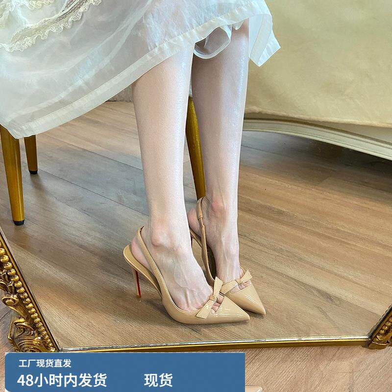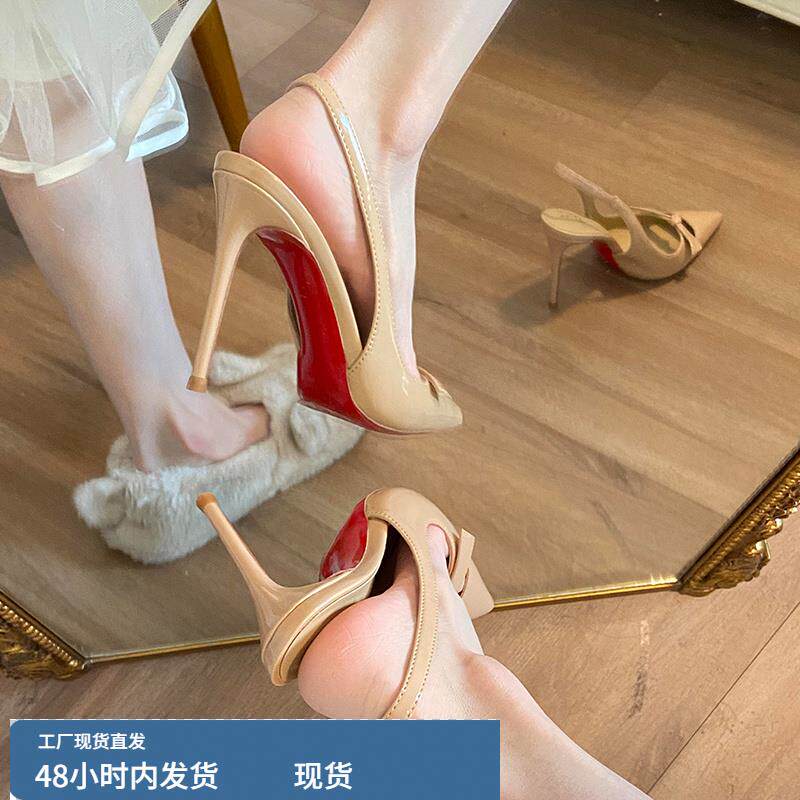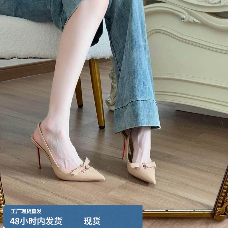 单鞋 法式 女细跟漆皮性感职业通勤后空高跟鞋 蝴蝶结裸色红底鞋 新款