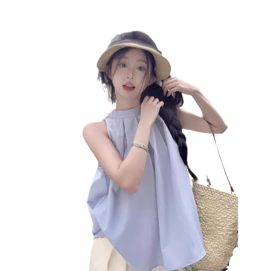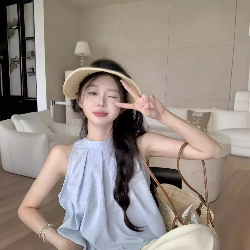 夏新款 女装 设计感别致褶皱蓝色上衣 挂脖衬衫 纯色今年流行无袖