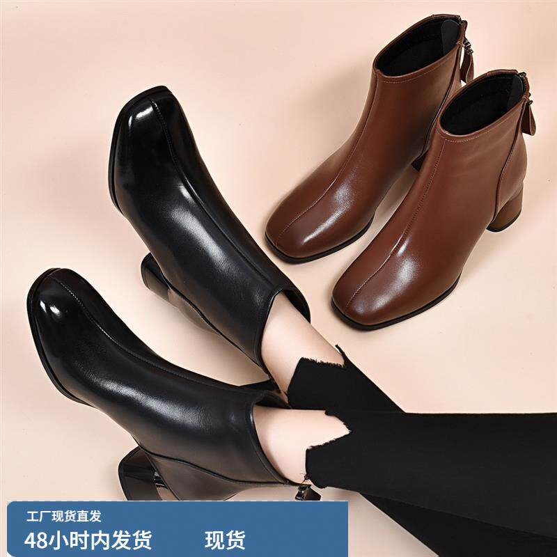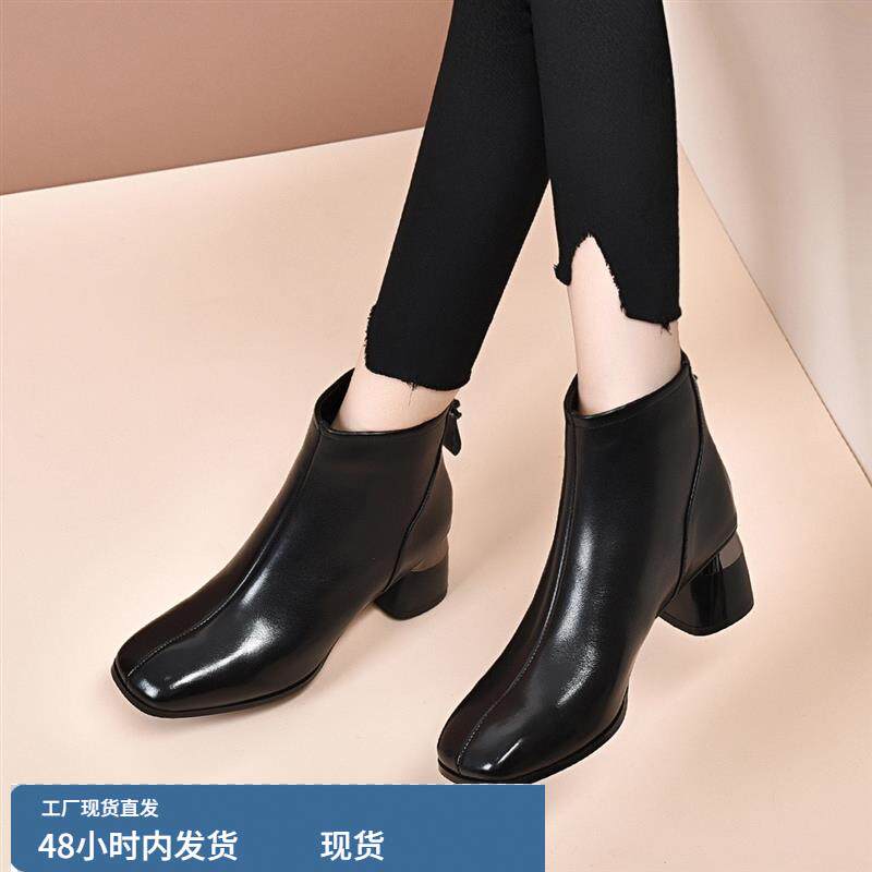 真皮方头中跟短靴女2024秋冬新款 粗跟软底单靴百搭低跟马丁靴加绒