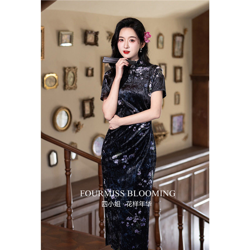 2026黑色碎花民高级感连衣裙收腰显瘦夏 国风旗袍 花样年华