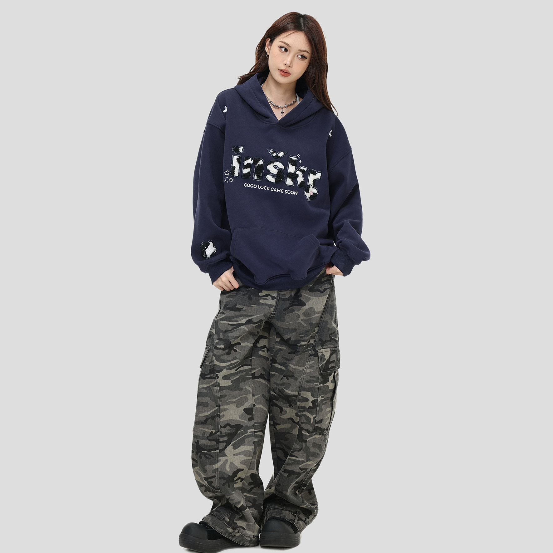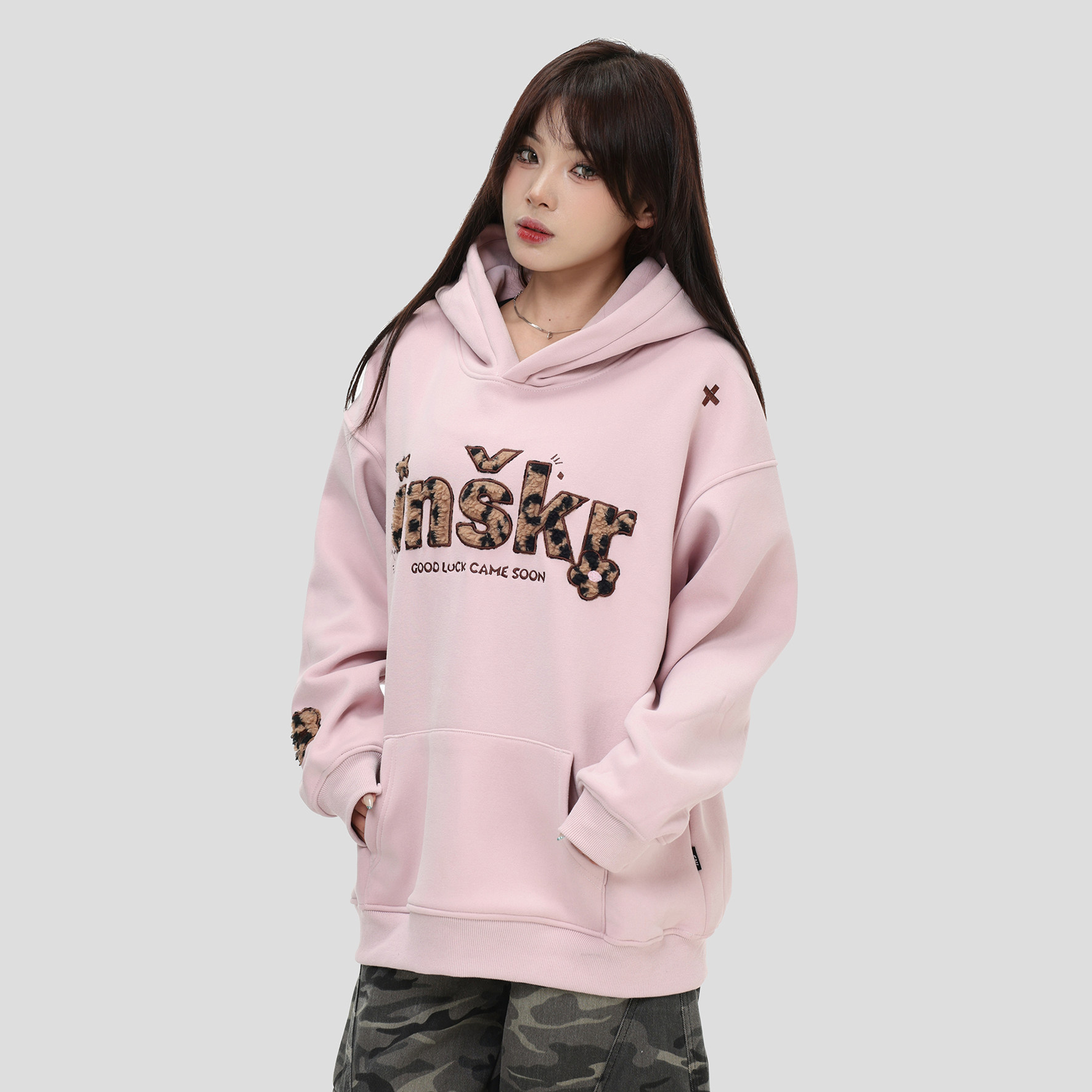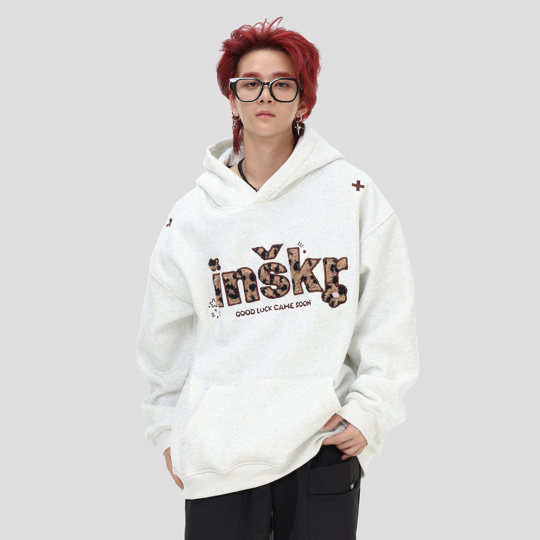 复古「拼音符号豹纹连帽卫衣」宽松加绒帽衫 INSstudios 国潮美式