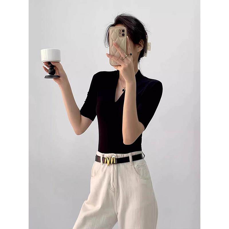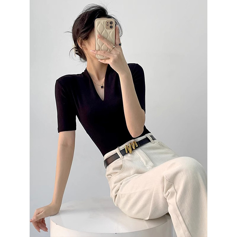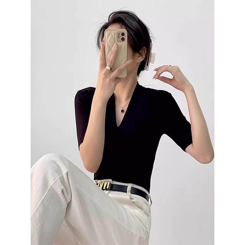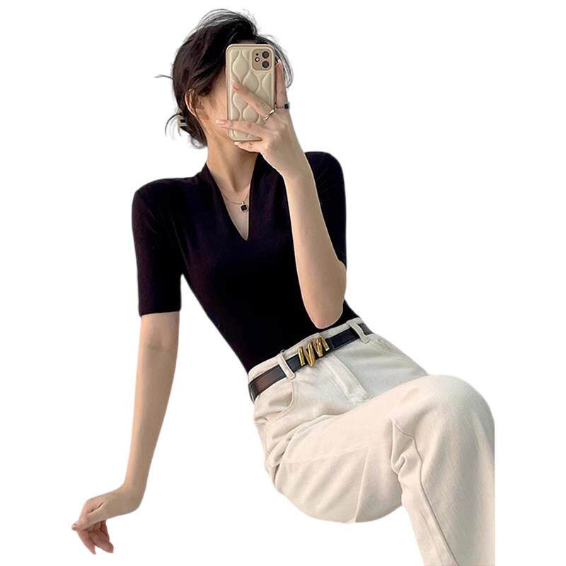 打底衫 高端大牌黑色V领短袖 显瘦中袖 修身 上衣 T恤女2026春秋新款