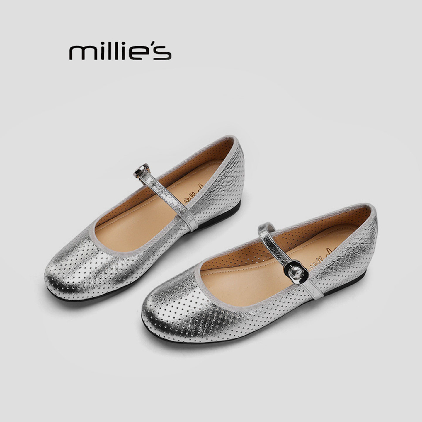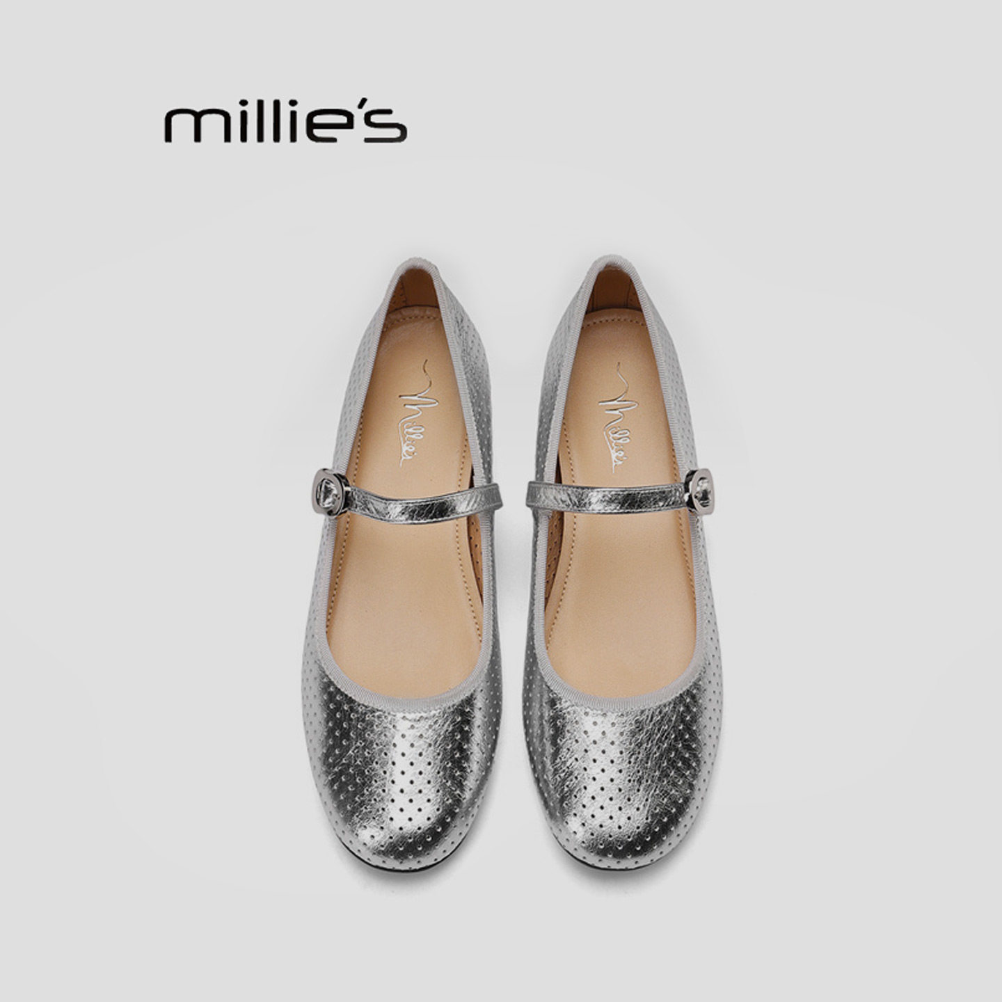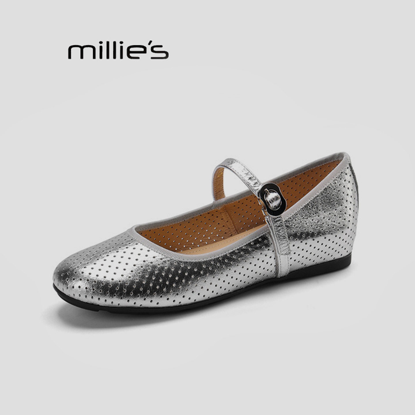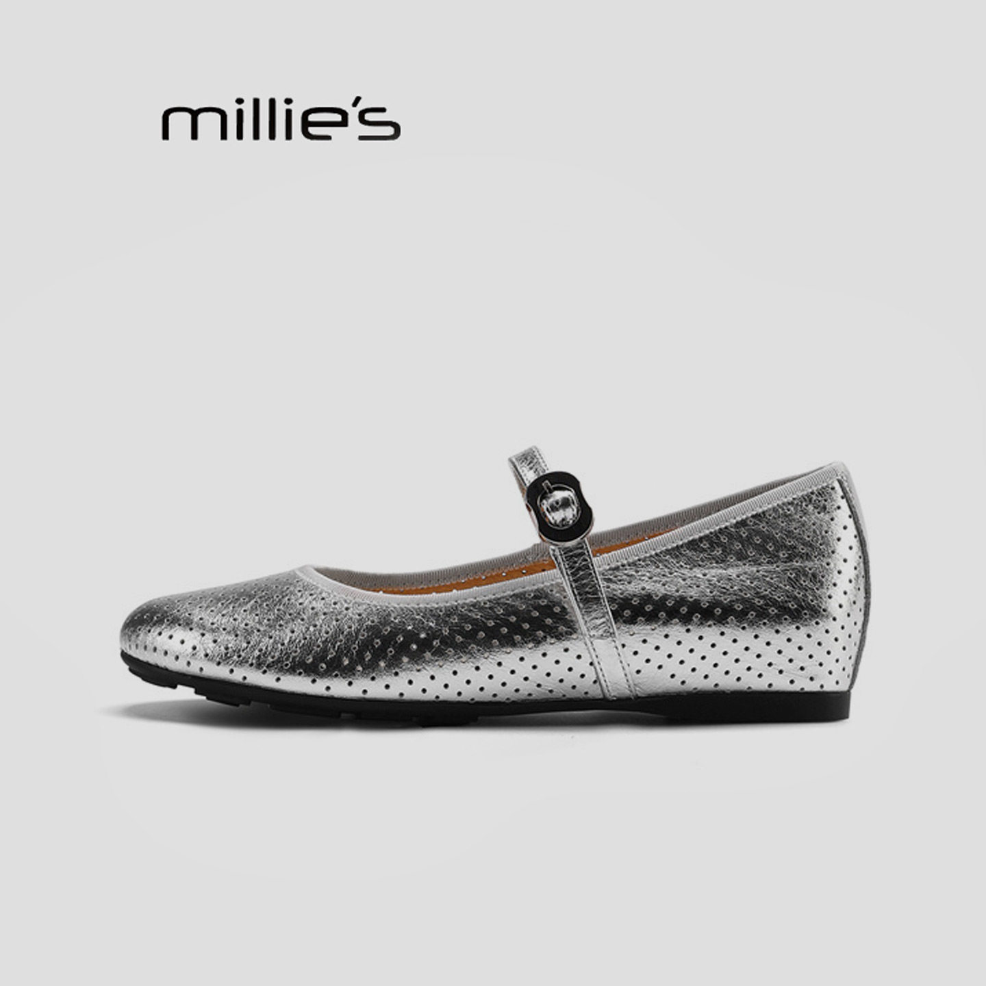 女一字扣带平底通勤单鞋 MILLIE 银色镂空玛丽珍鞋 妙丽2026春季
