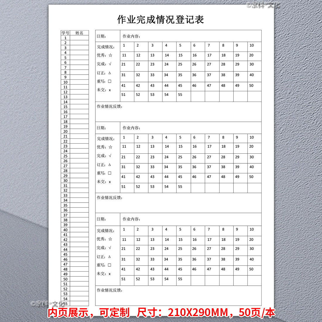 作业完成情况登记本班级作业完成情况登记表作业登记本日日清记录本小学初中50张单面京科A4可自定义定制