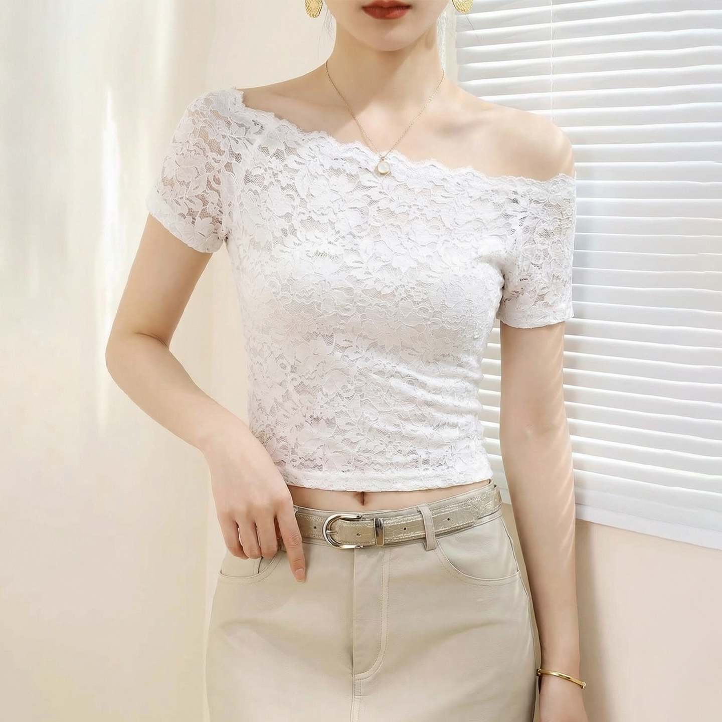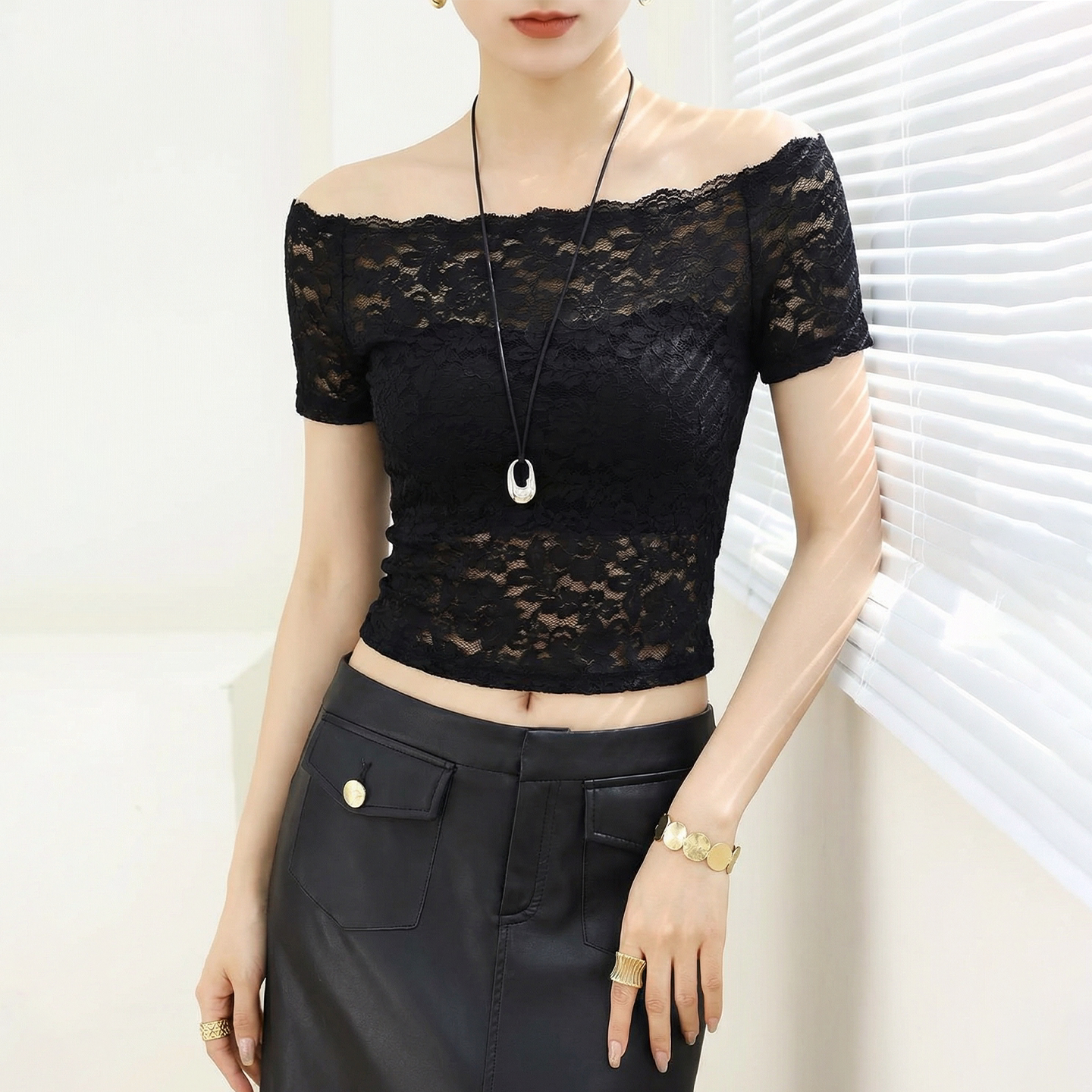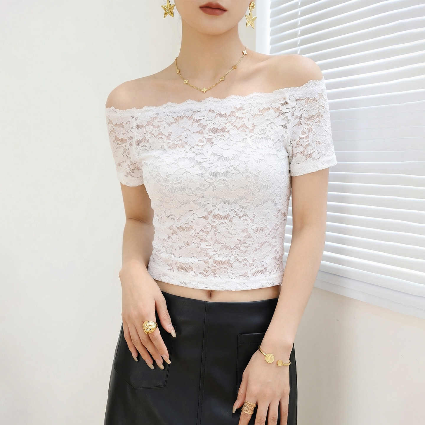 夏 超好看绝美短袖 黑色一字肩蕾丝网纱上衣女漂亮独特修身 显瘦短款