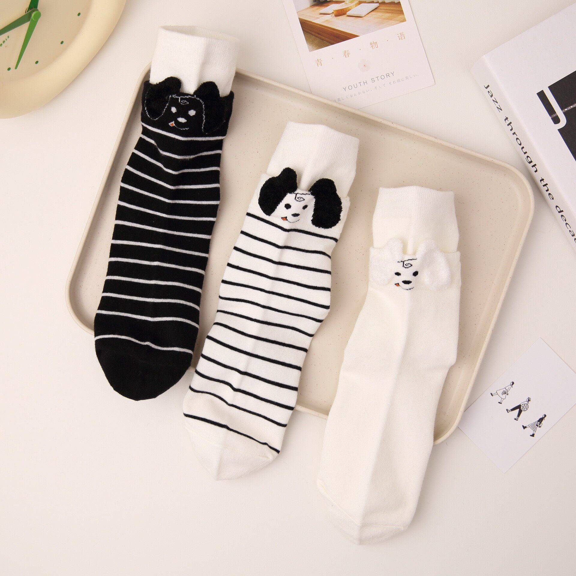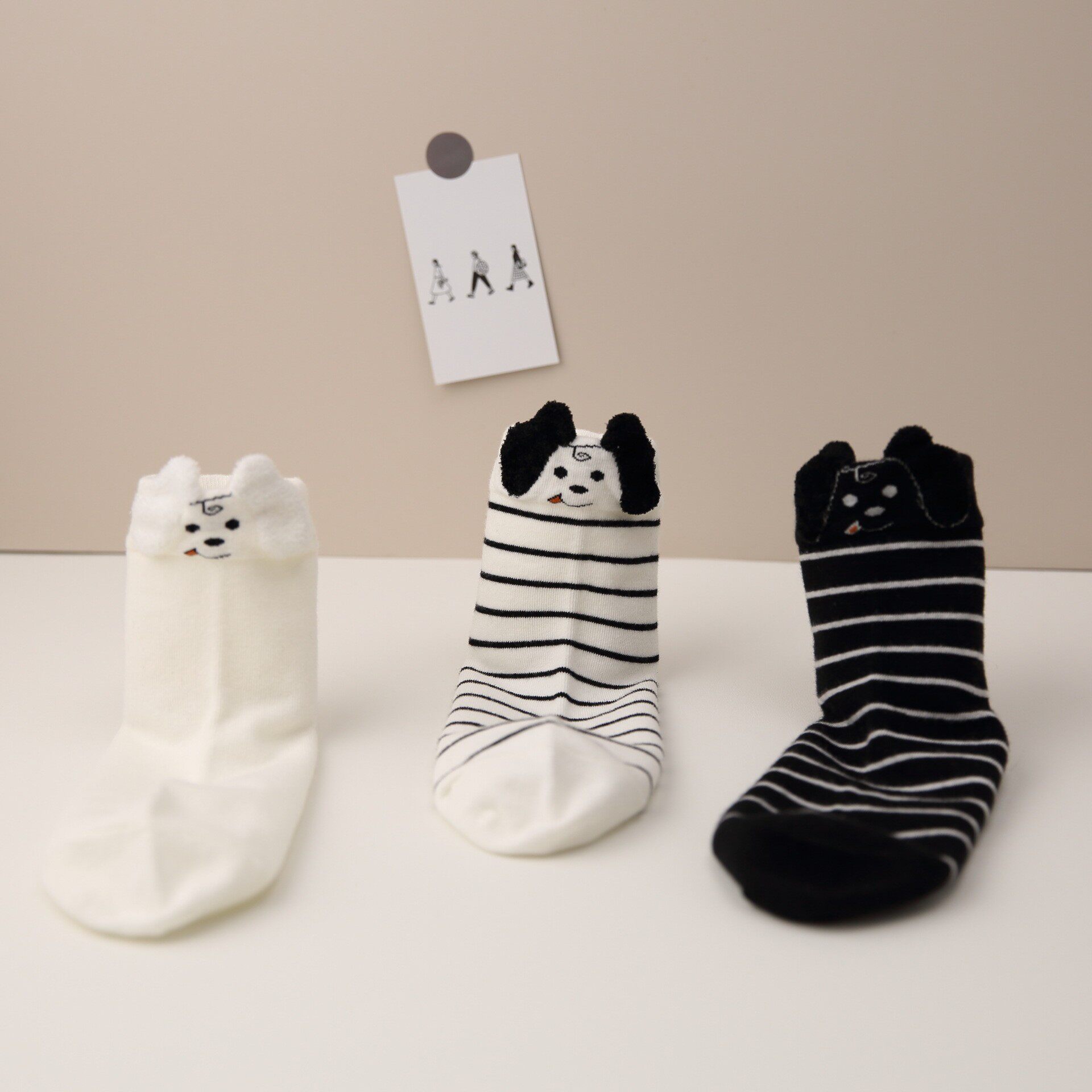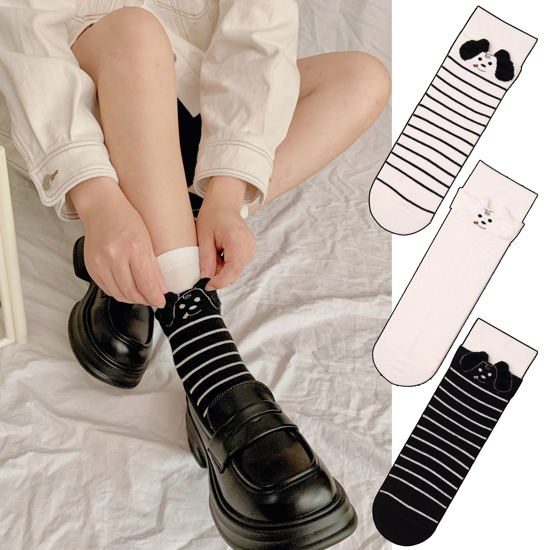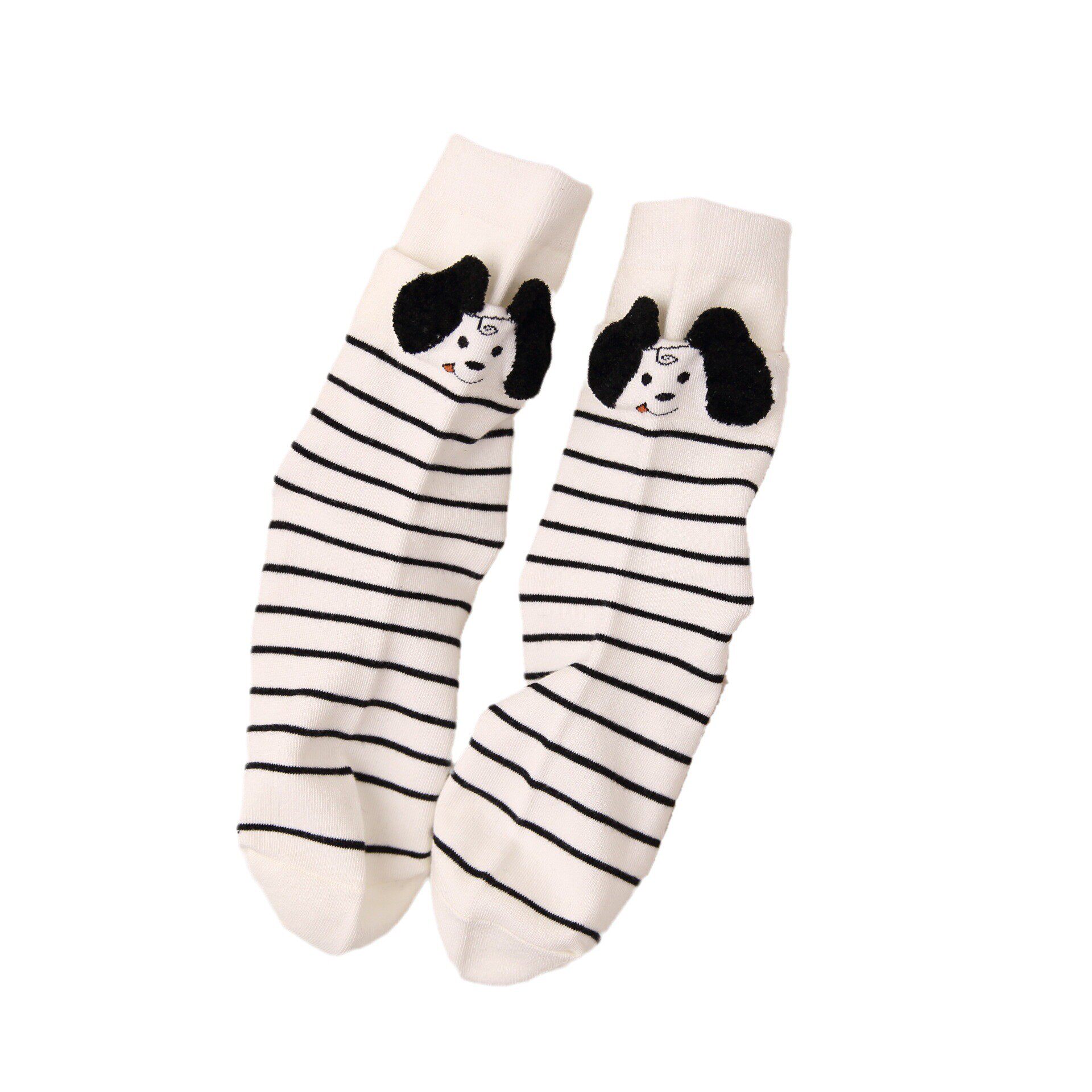 两穿原创秋冬袜子女袜双罗口立体小狗狗袜条纹网红ins潮中筒袜