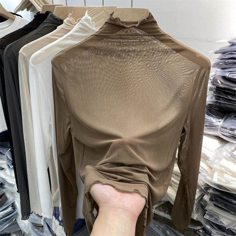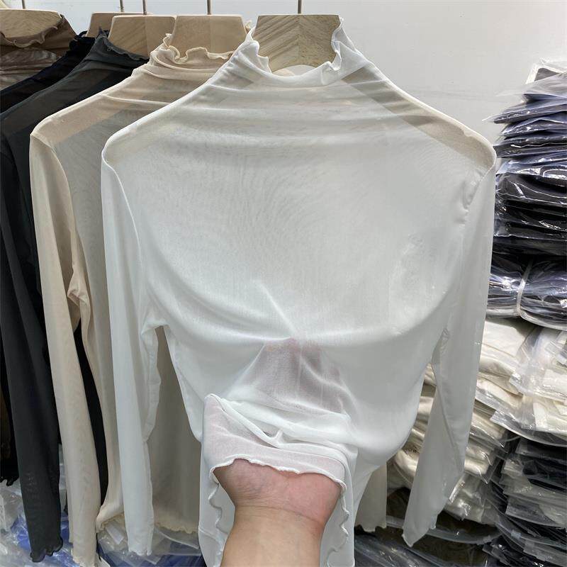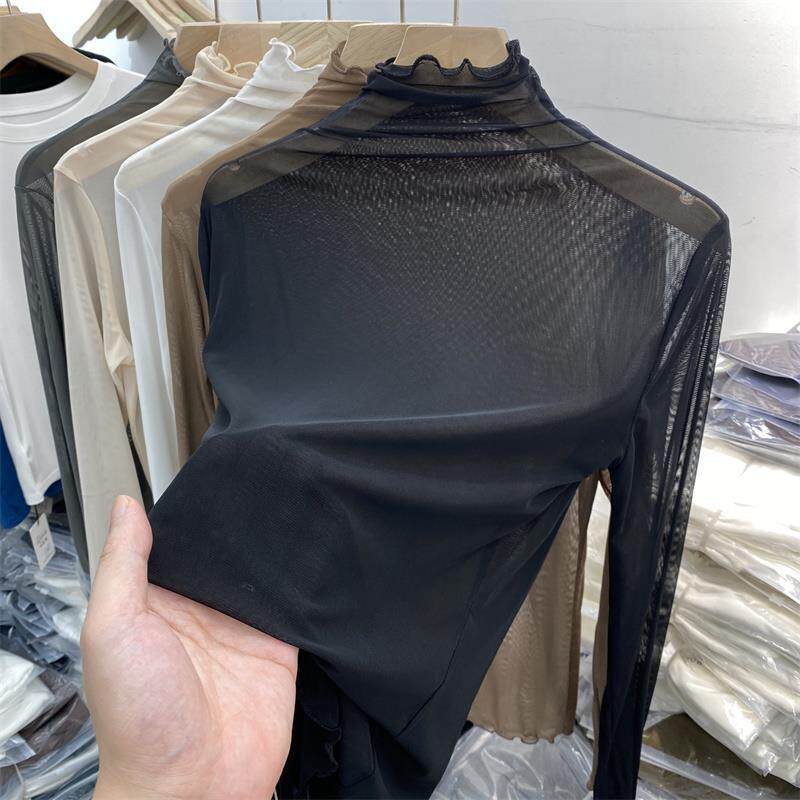 T恤打底衫 欧货2025年夏季 透视网纱长袖 堆堆领内搭上衣女薄款 新款