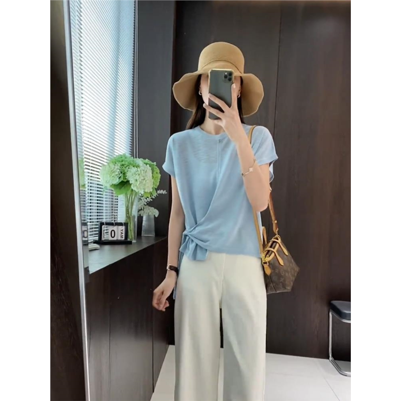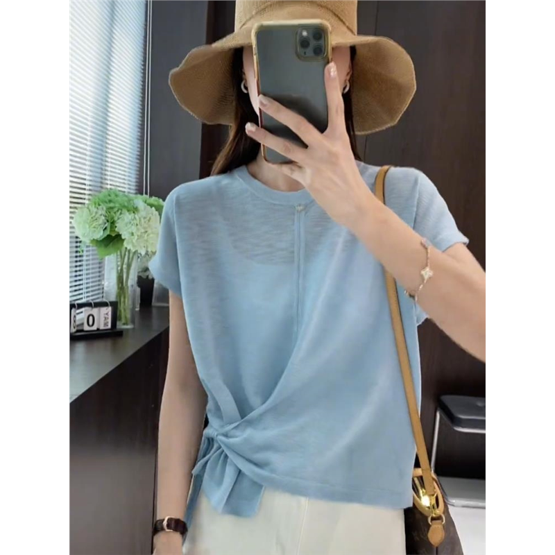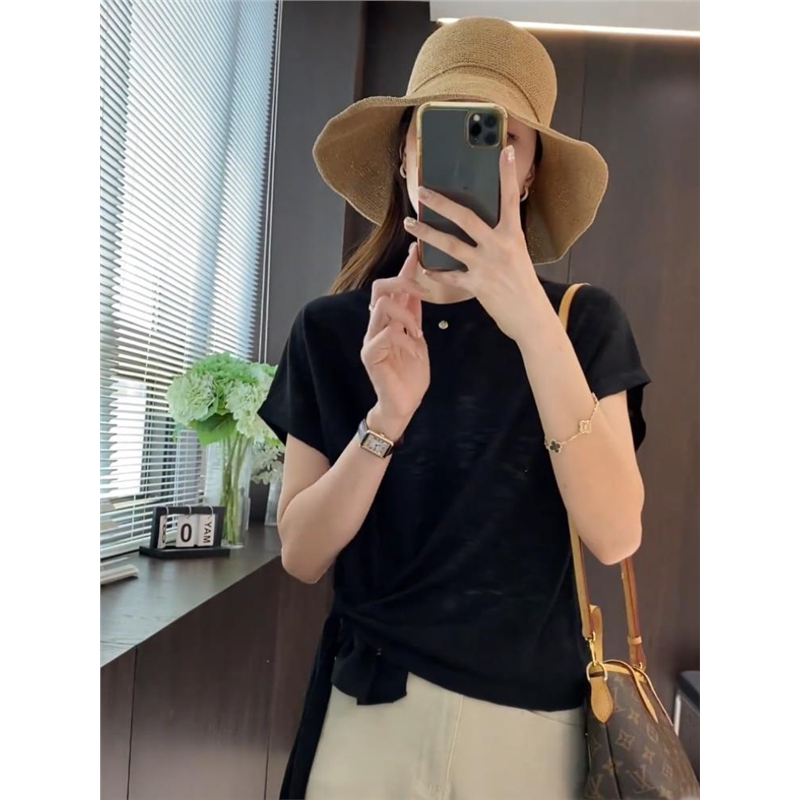 冰丝微透气质空调衫 韩系纯色高级感系带短袖 2024新款 女夏季 针织衫