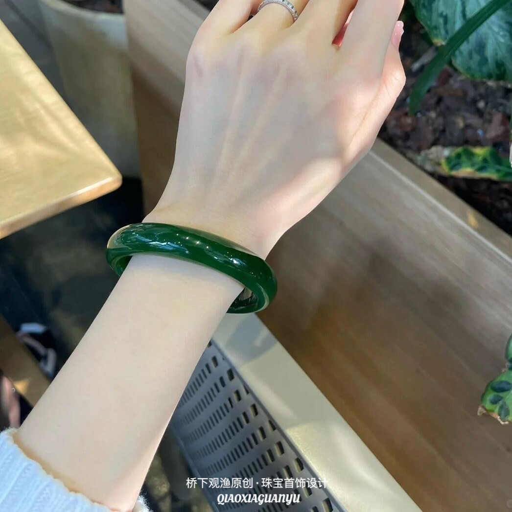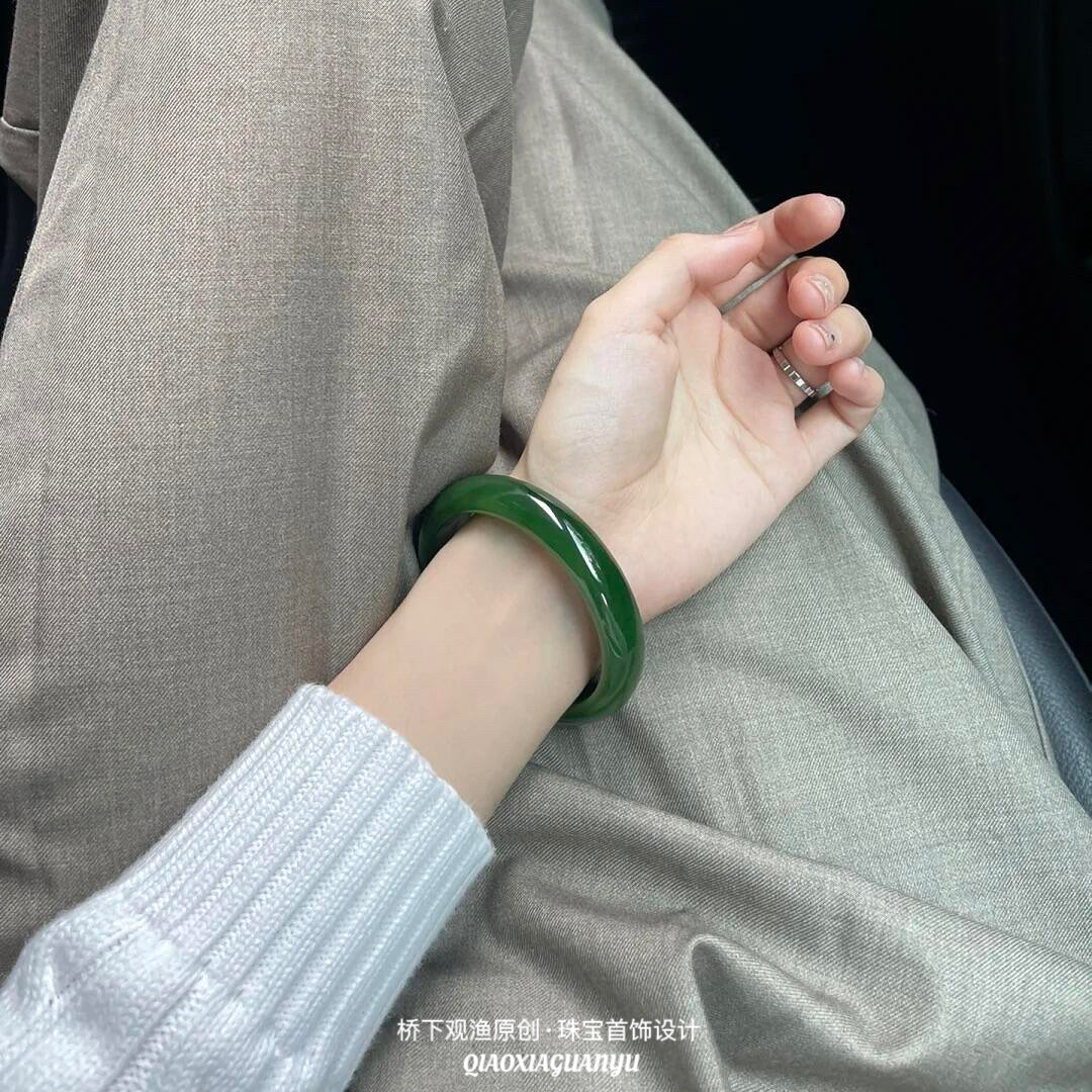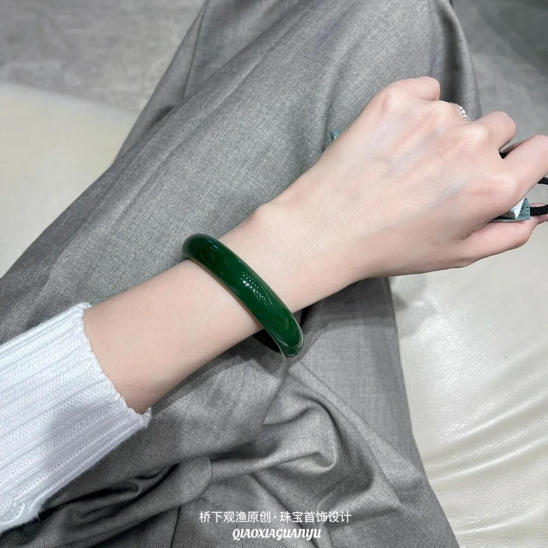天然玛瑙冰种翡翠色绿玉髓手镯女菠菜绿美人镯帝王绿玉镯10mm正圈