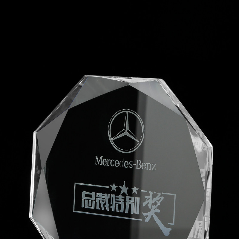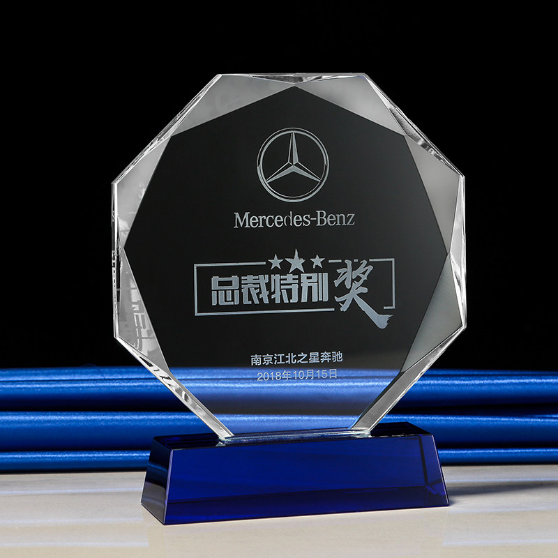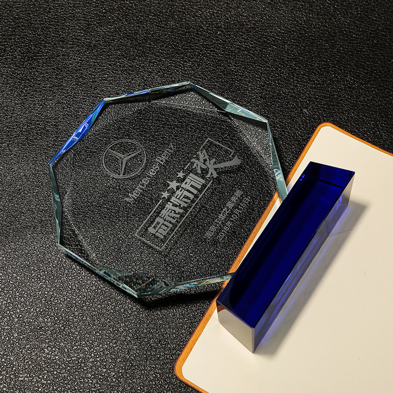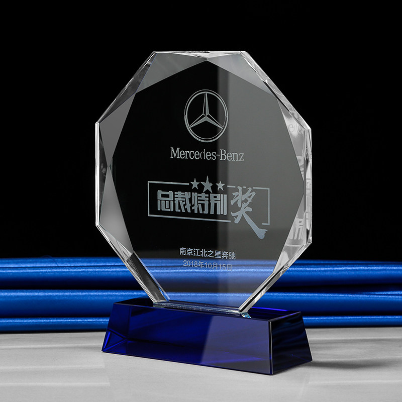 创意八角水晶奖杯蓝色奖牌定制制作员工商务活动授权牌退休纪念品