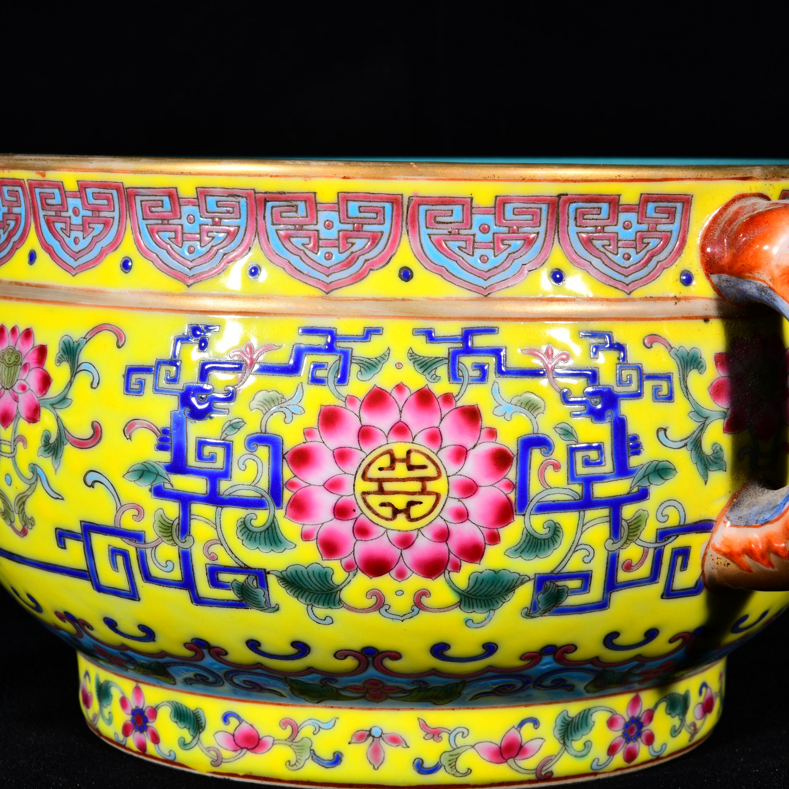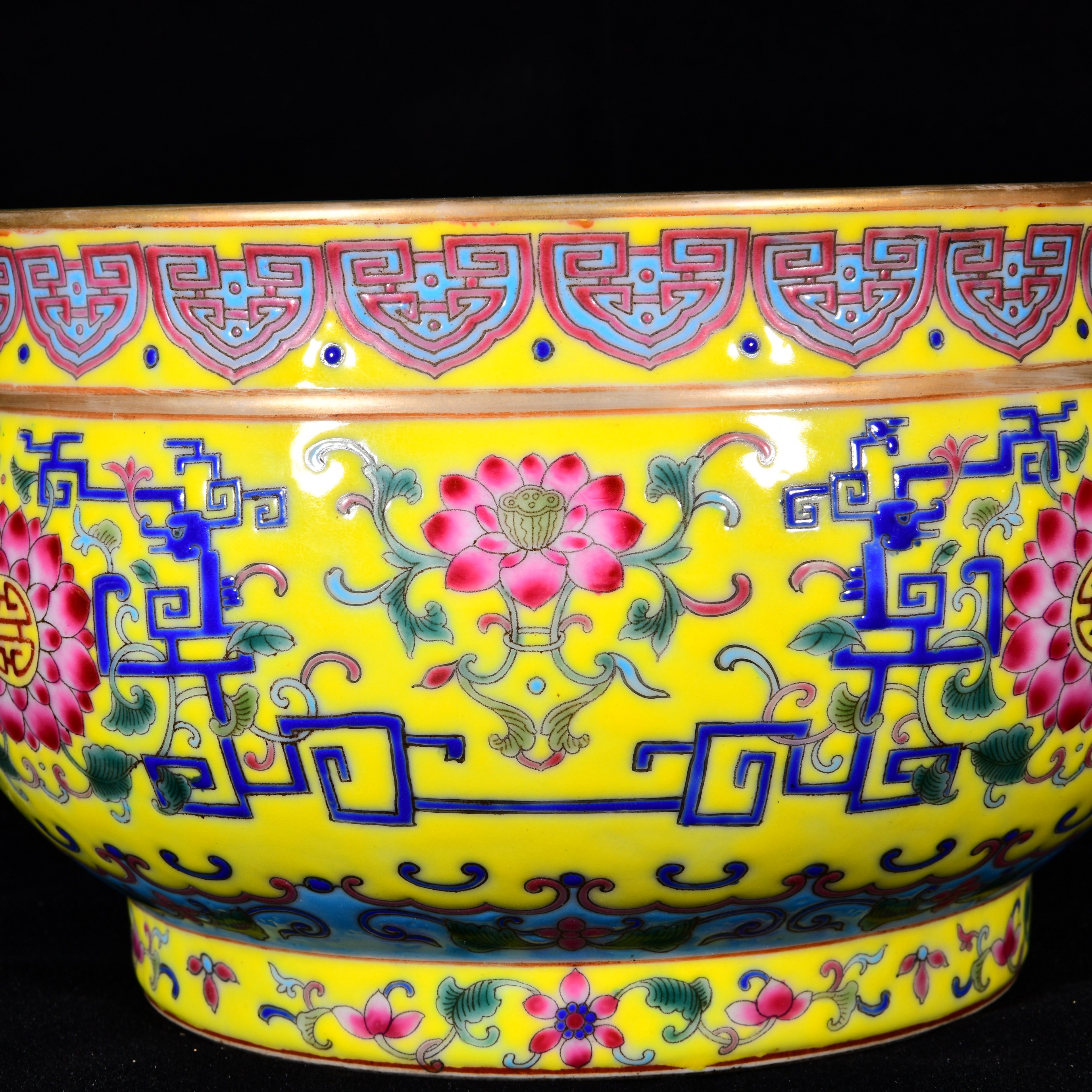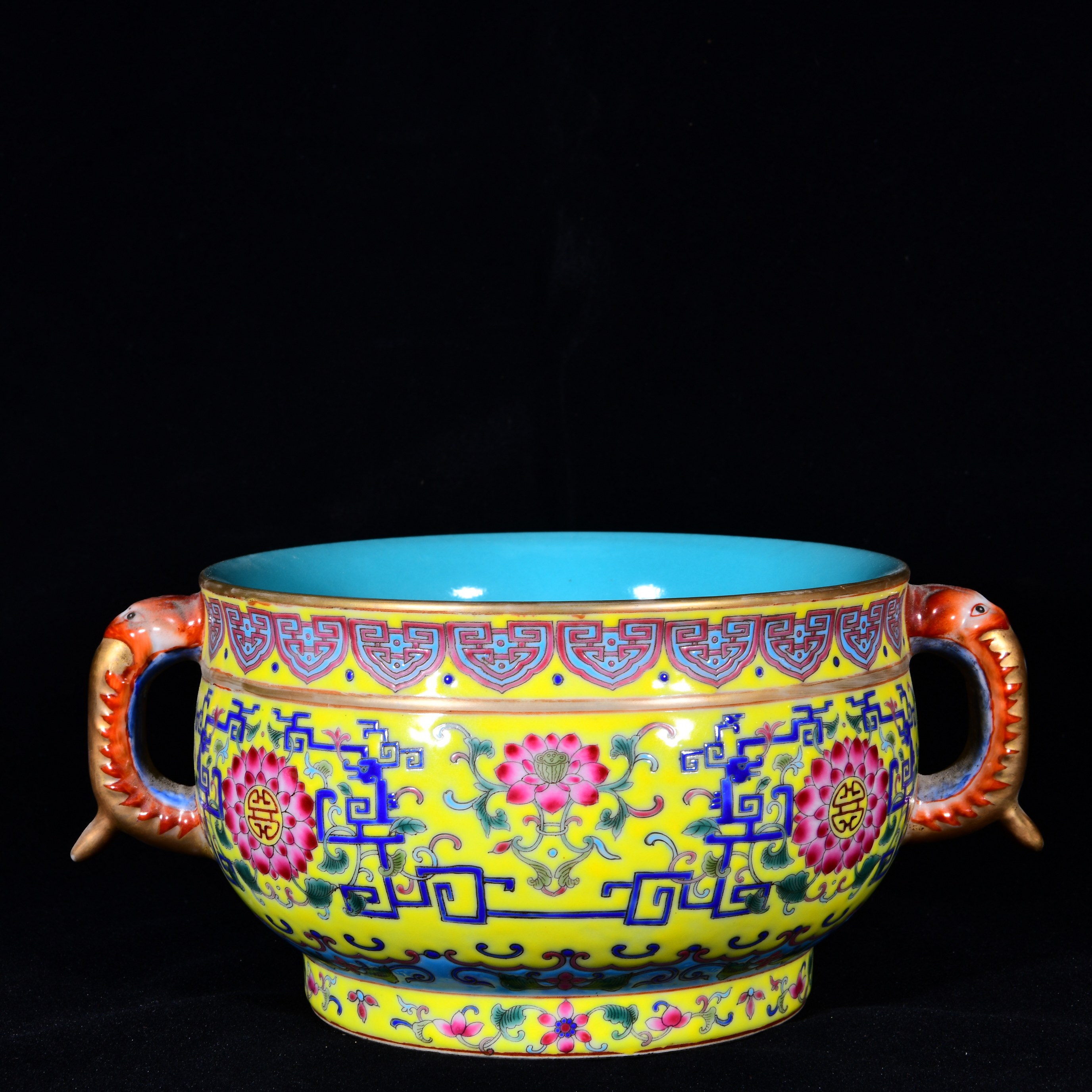 大清乾隆年制黄地珐琅彩缠枝莲宝相花拐子龙纹描金簋式 香炉