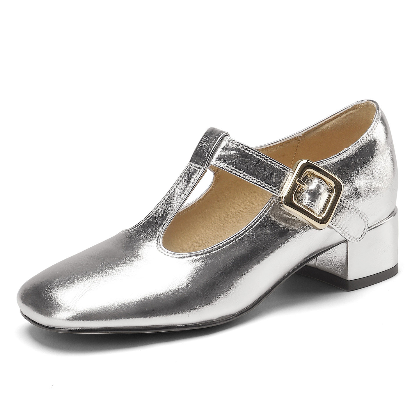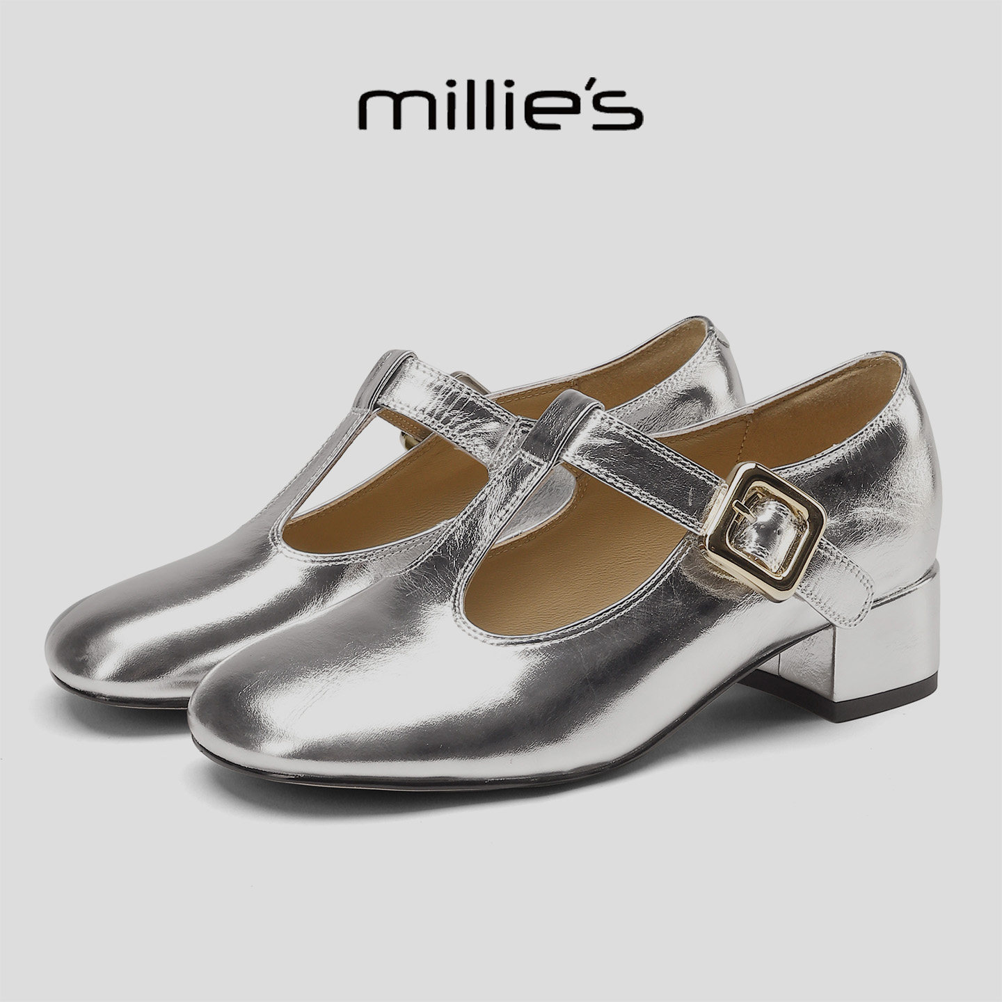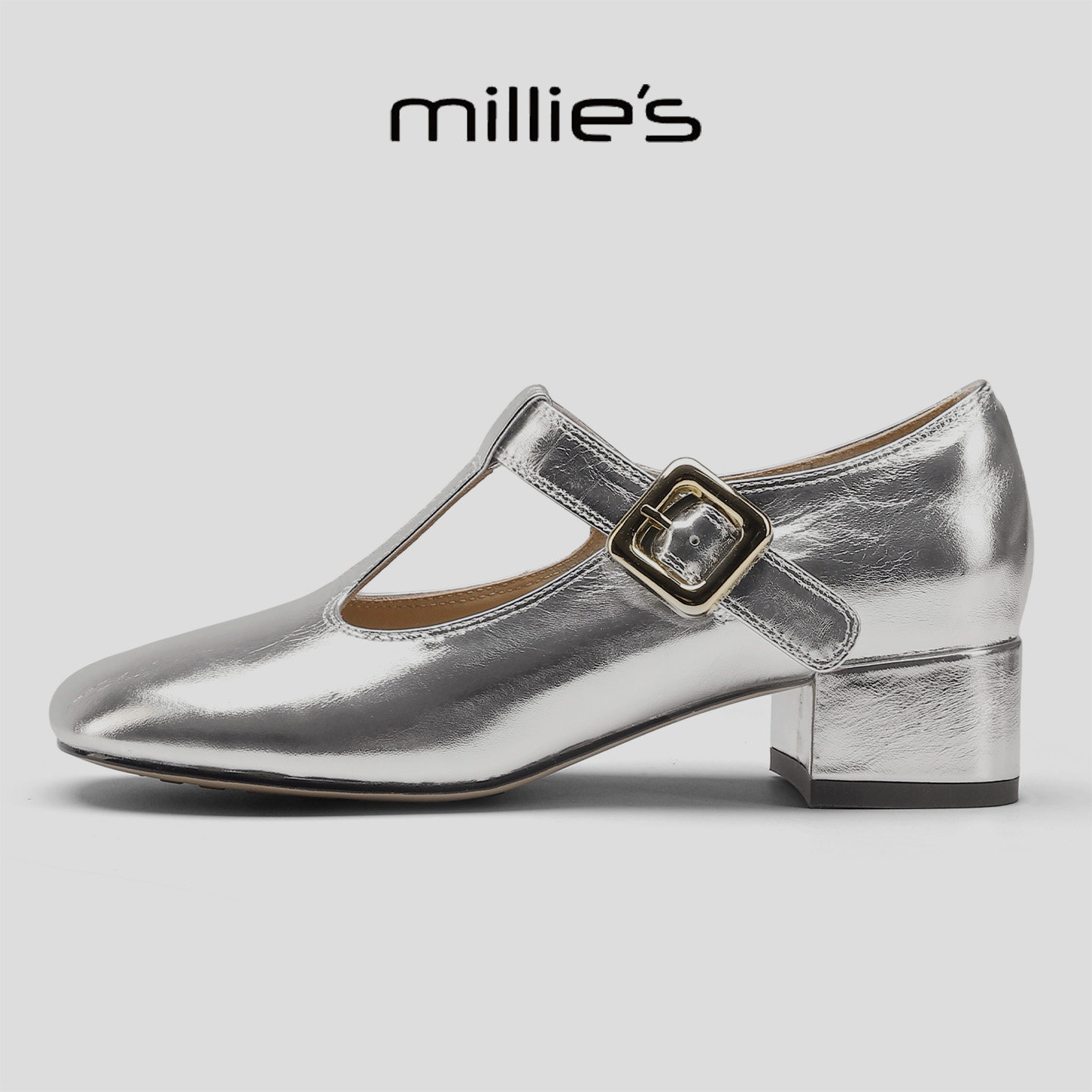女复古风T字扣粗跟单鞋 妙丽巨好看春季 银色玛丽珍鞋 爆款 MILLIE
