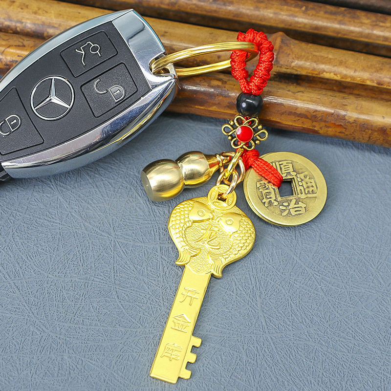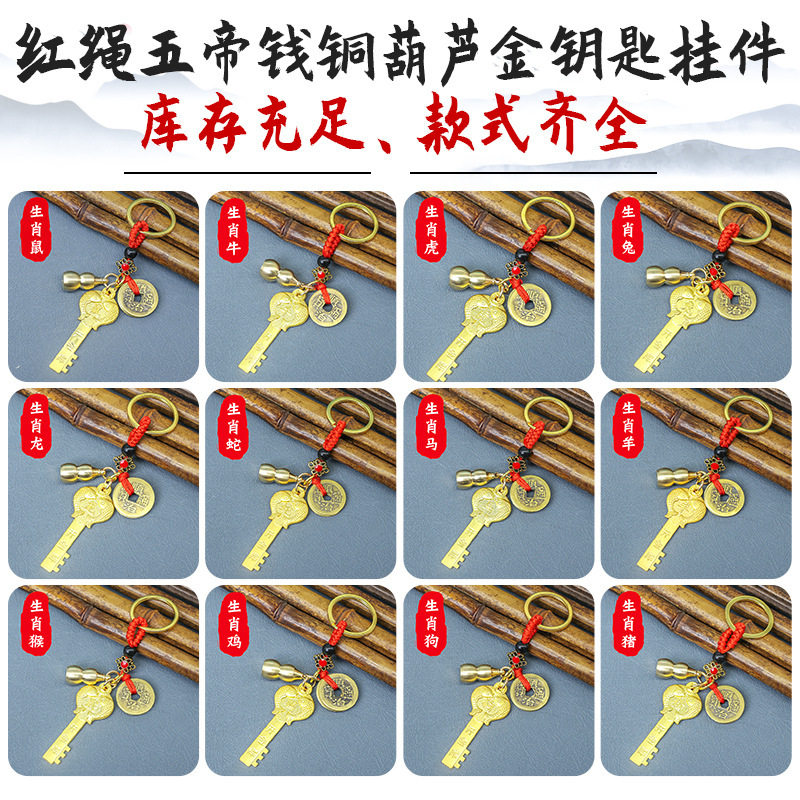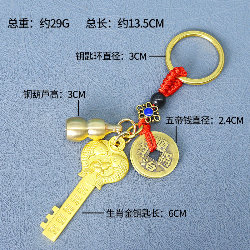 爆款 黄铜生肖金钥匙五福开金库黄铜五帝钱钥匙扣铜葫芦守护神挂件