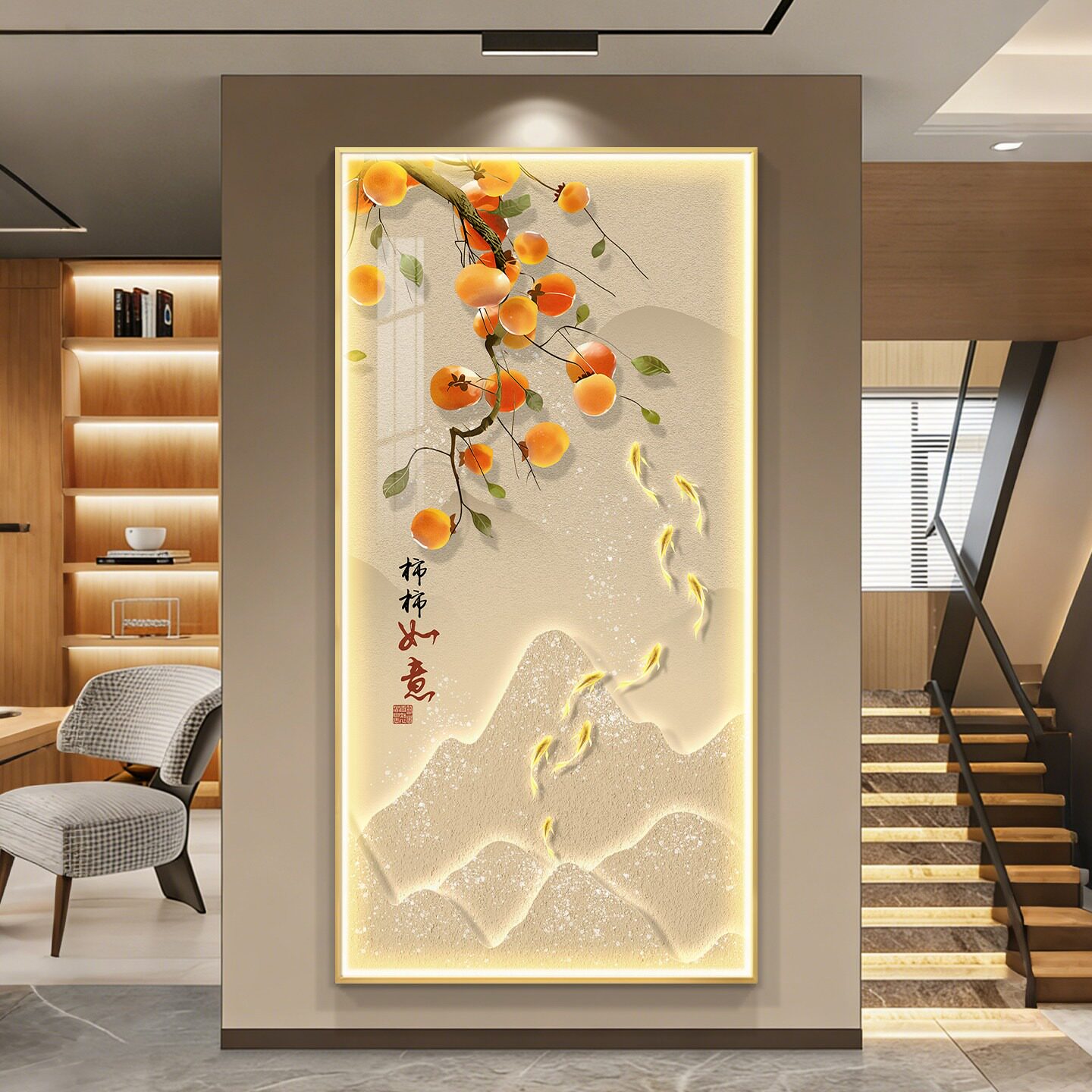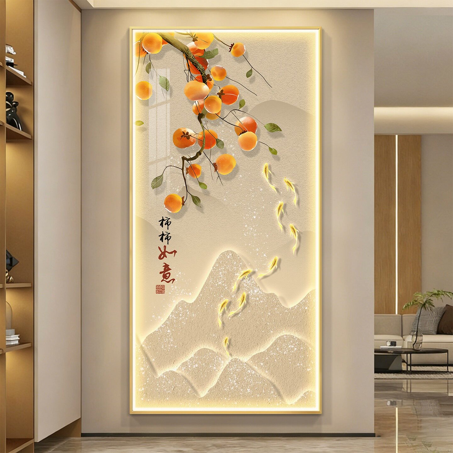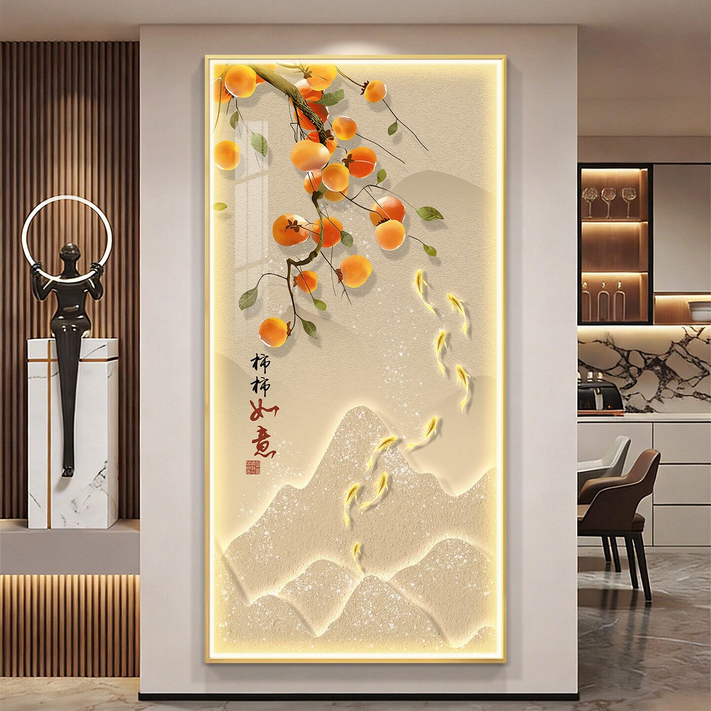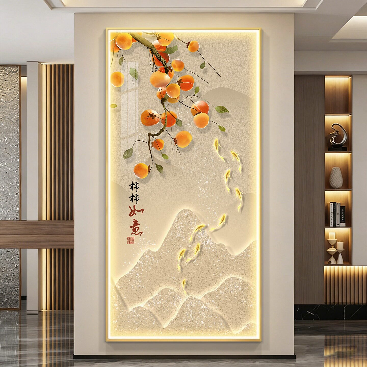 柿柿如意入户玄关装 饰画高级感九鱼图挂画带灯光走廊过道餐厅壁画