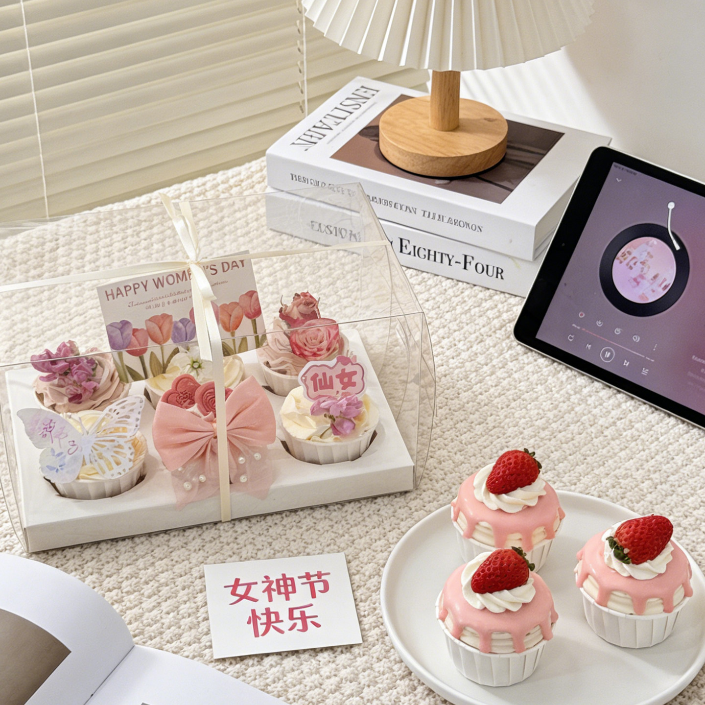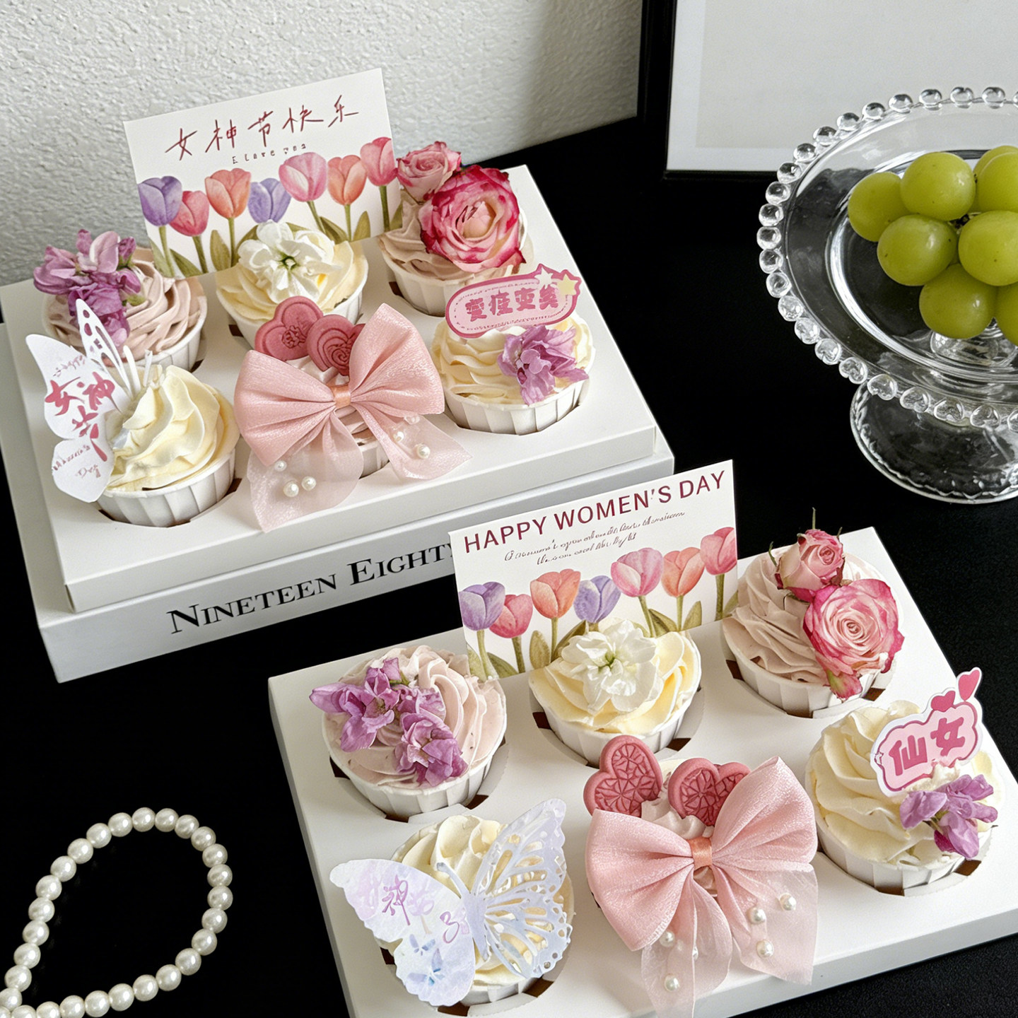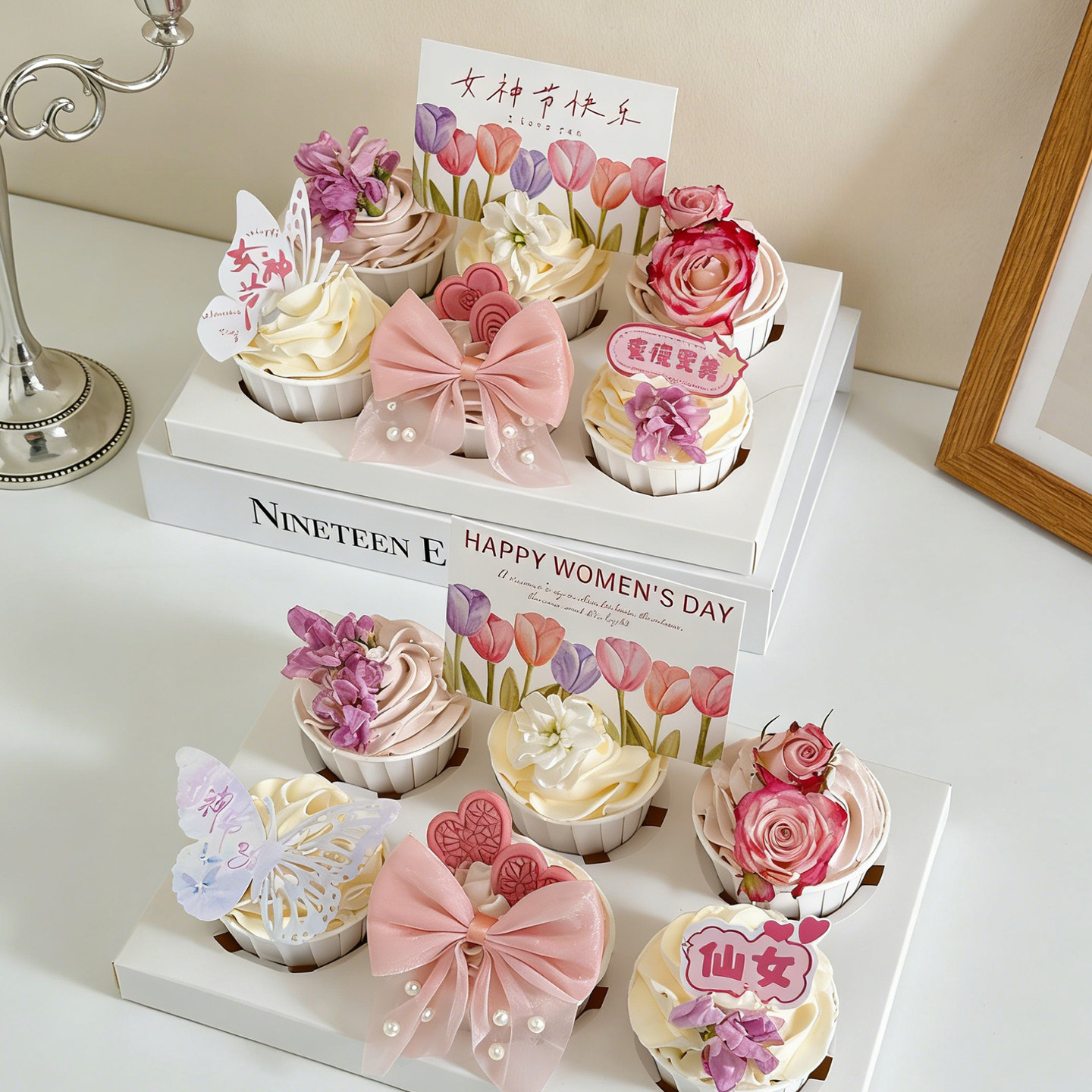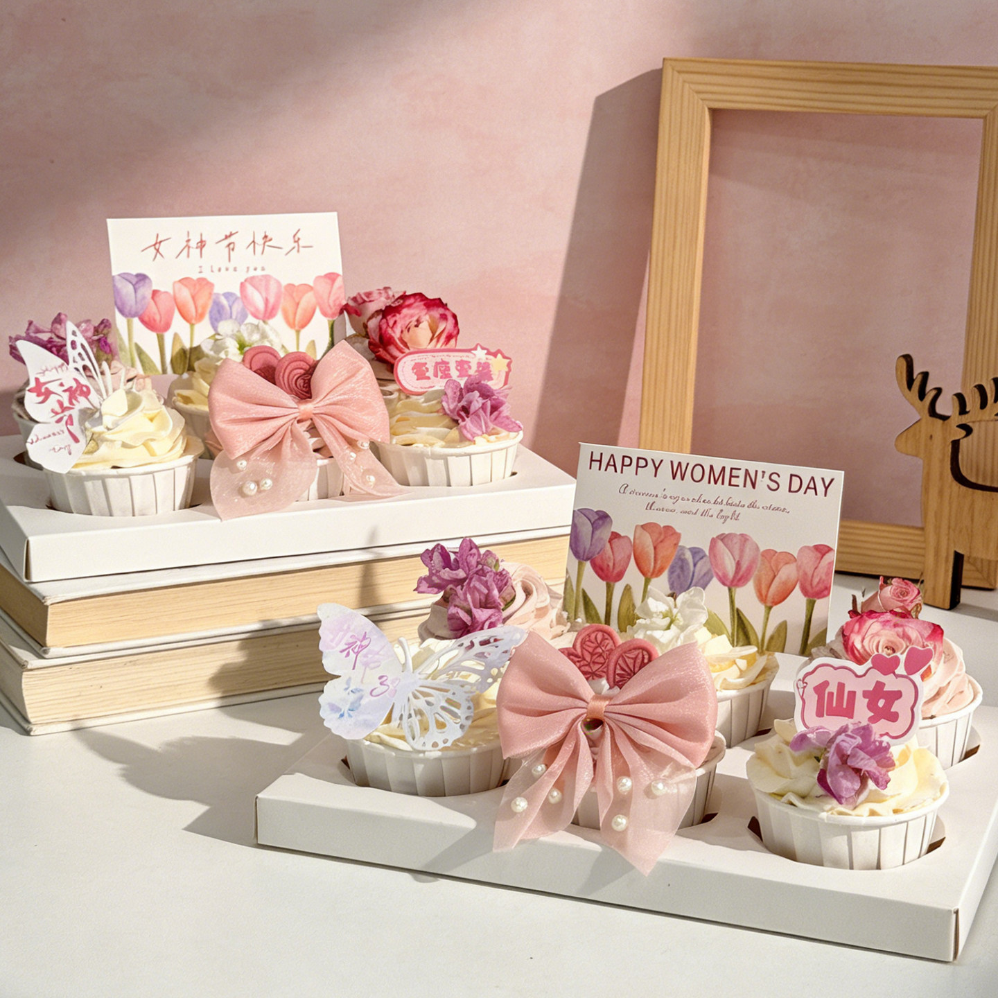 38妇女节鲜花纸杯蛋糕装 饰亚克力蝴蝶女神节快乐郁金香卡片插件