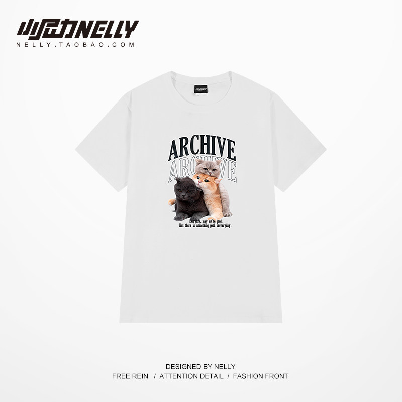 T恤 潮流创意猫咪印花短袖 男日系小清新宽松港风体恤学生 韩版 夏季