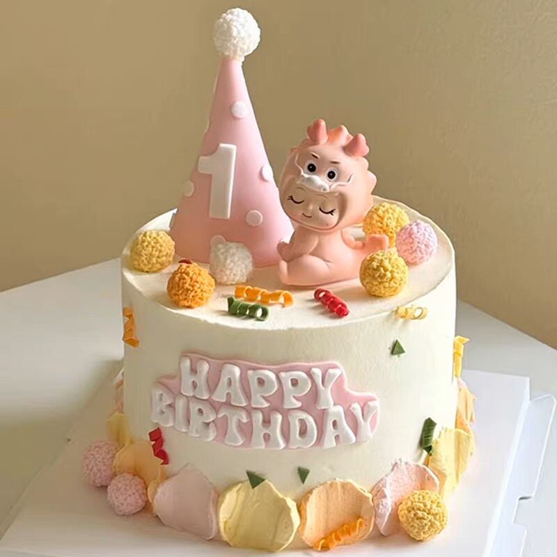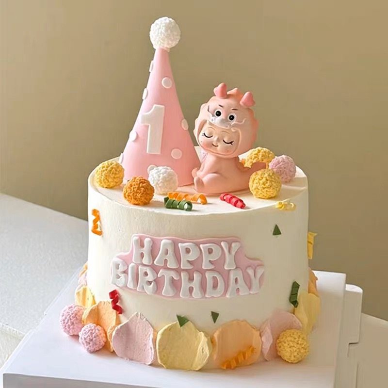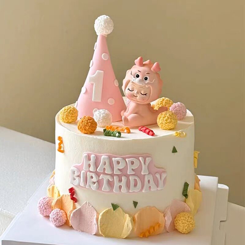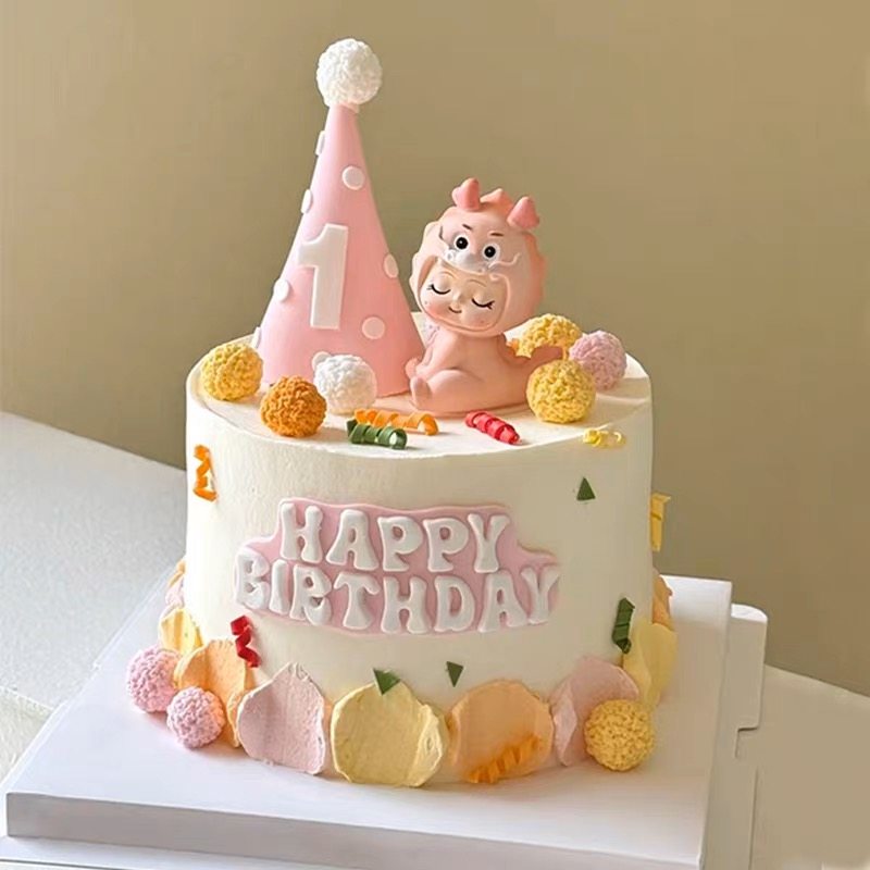 粉色可爱龙宝宝满月百天周岁蛋糕装 饰品摆件生日帽甜品台烘焙插件