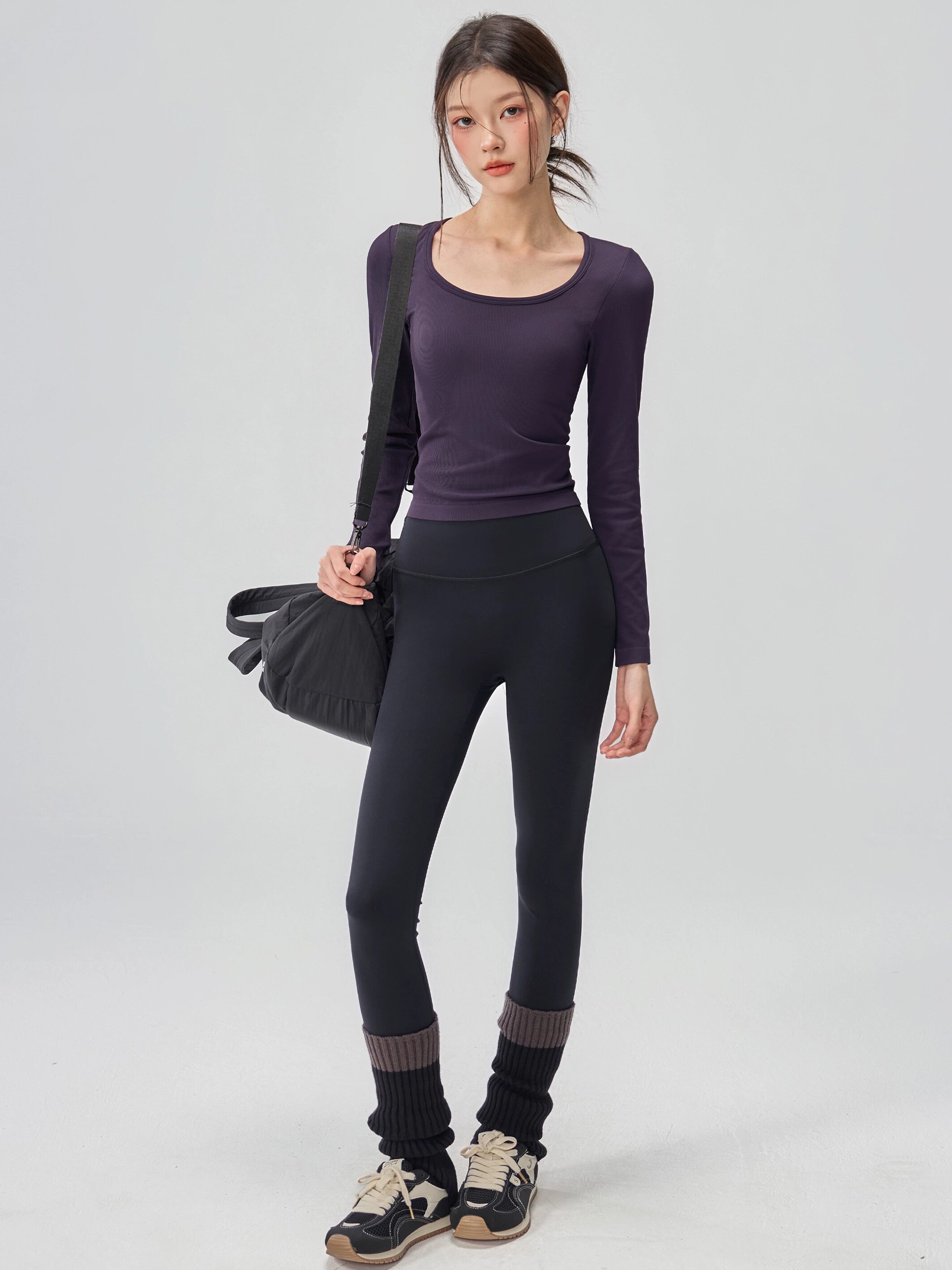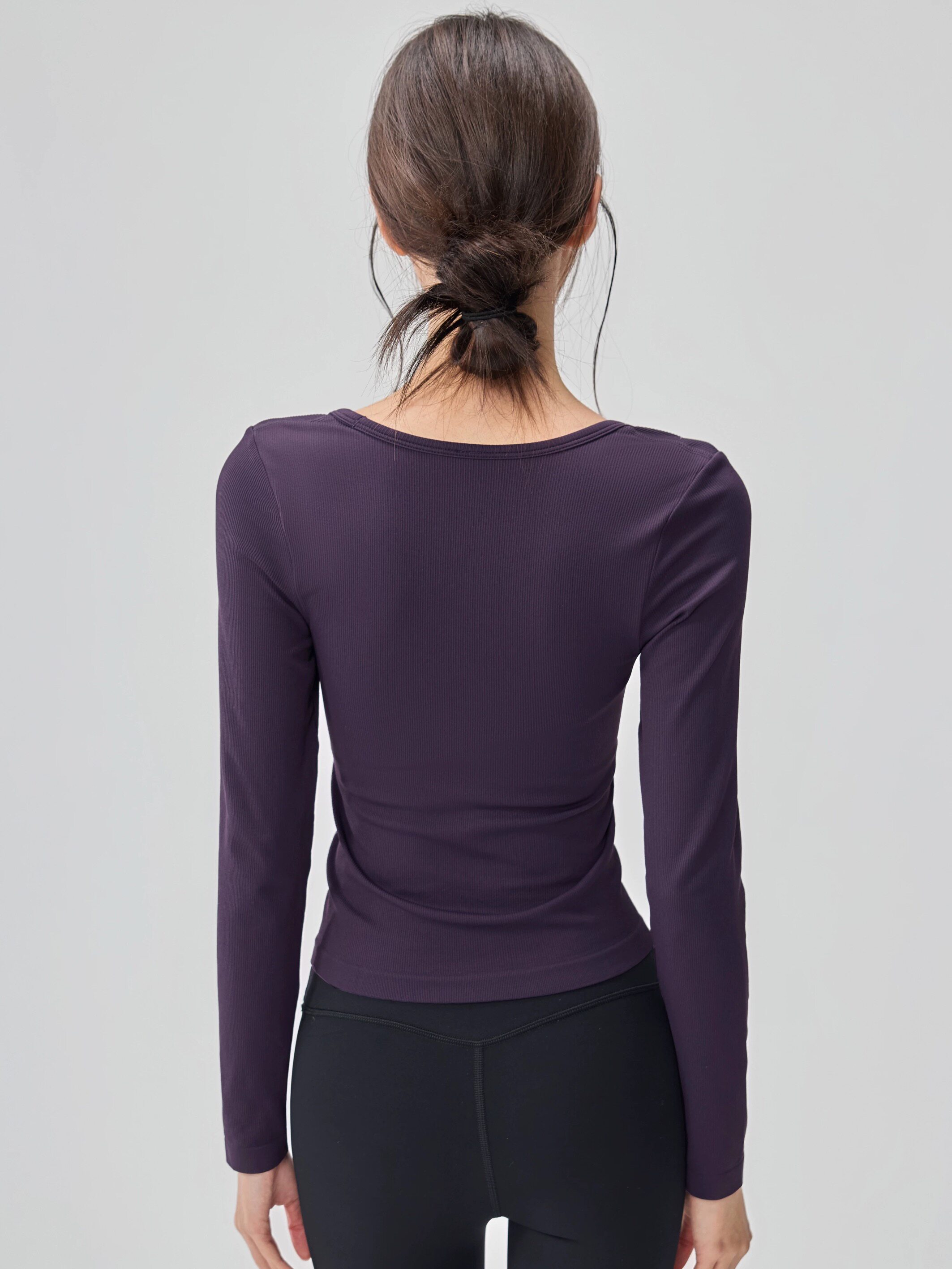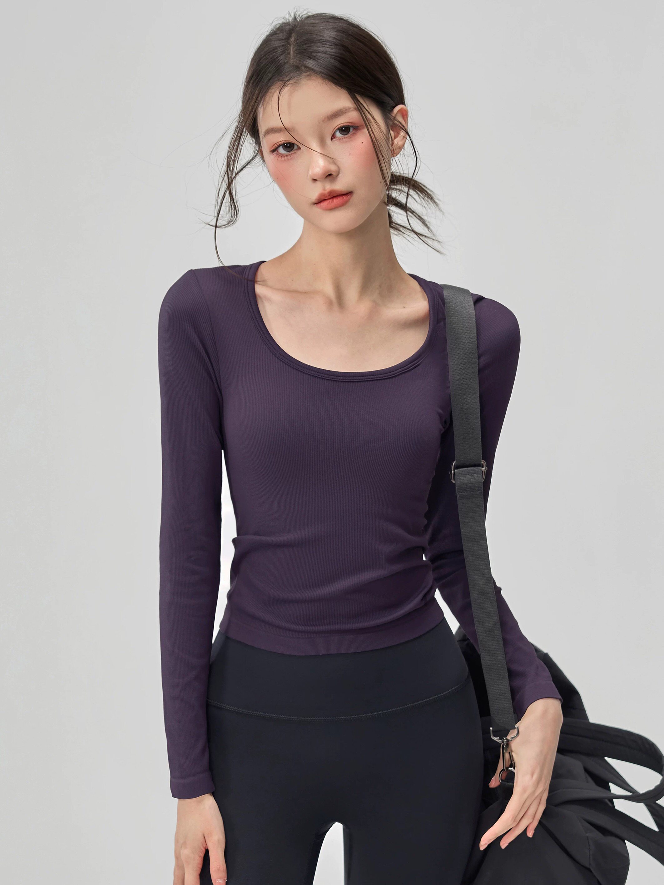 洋白菜U领瑜伽服女带胸垫显瘦健身普拉提长袖 高弹螺纹运动上衣秋