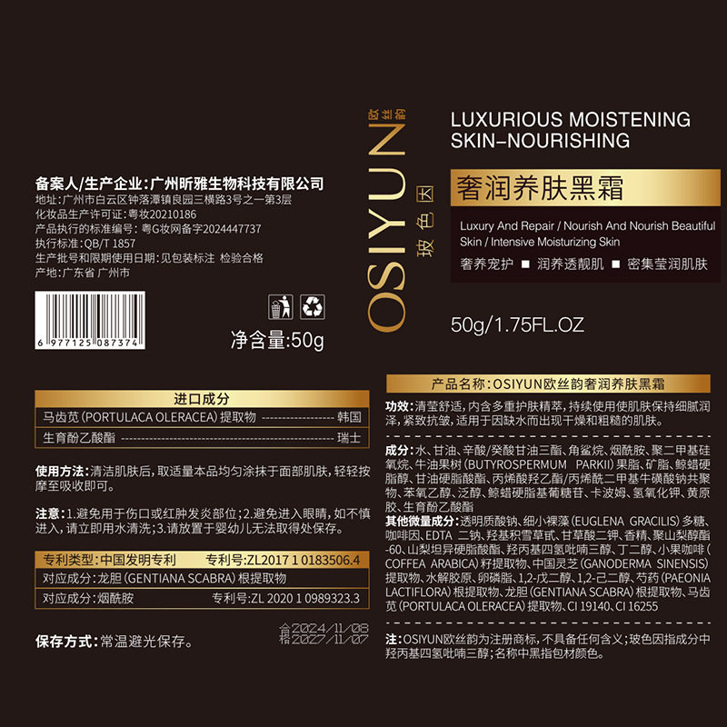 欧丝韵奢润养肤黑霜补水保湿 淡纹初老贵妇膏抗皱玻色因面霜护肤品