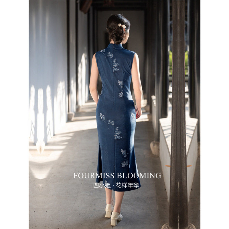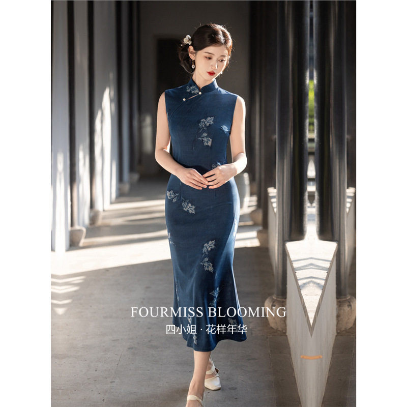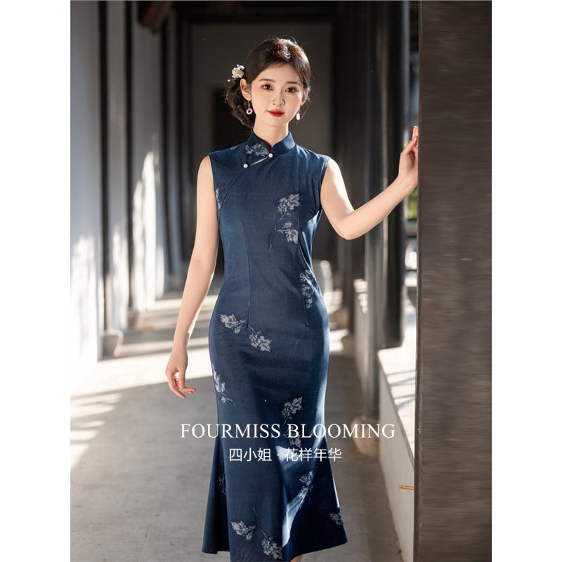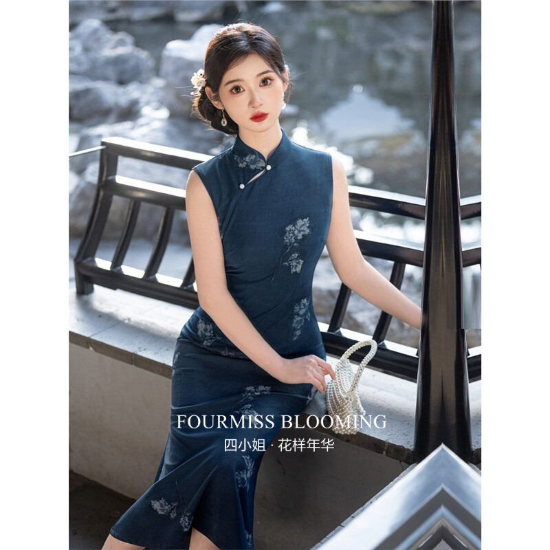 高级感单层夏季 蓝色无袖 国风旗袍 连衣裙穿新中式 花样年华
