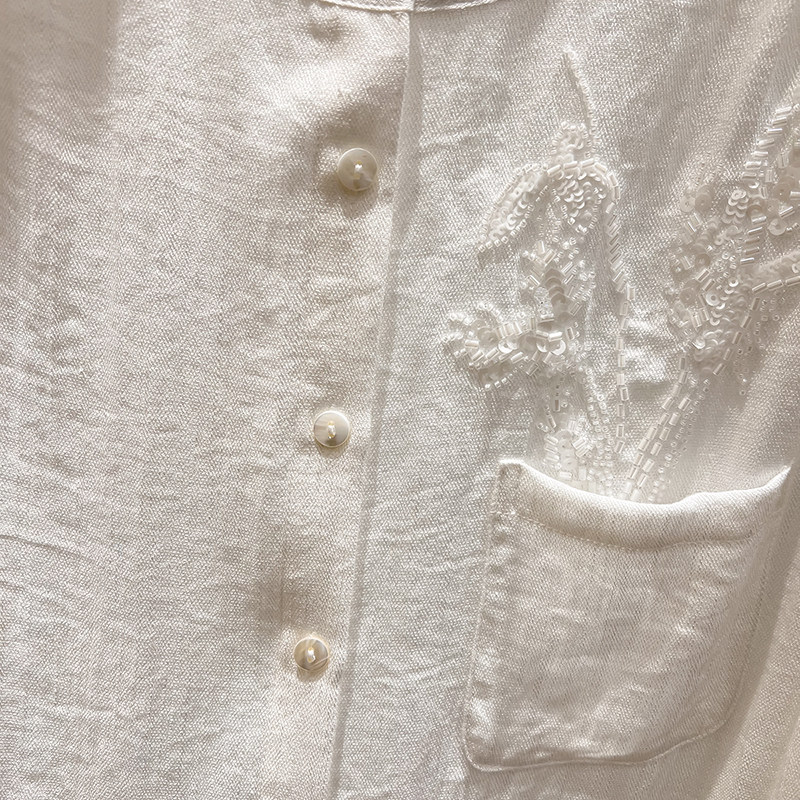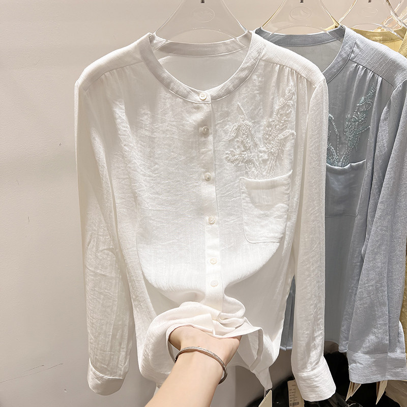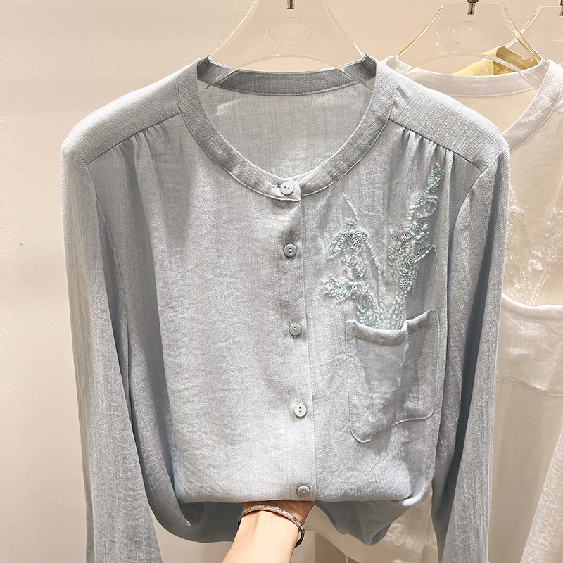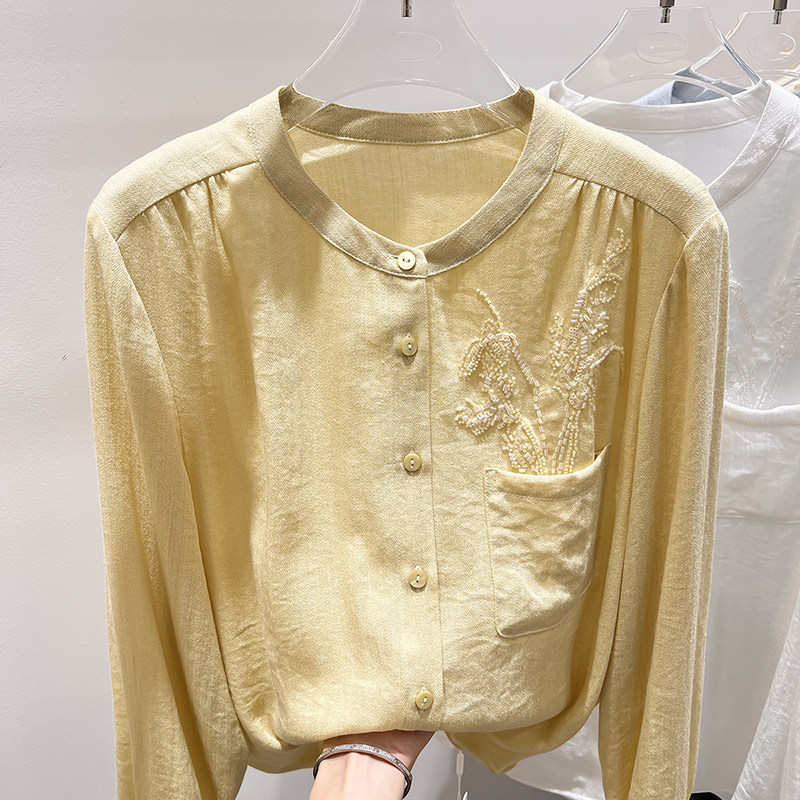 法式 上衣女春季 修身 衬衫 显瘦圆领口袋钉珠单排扣长袖 2026新款