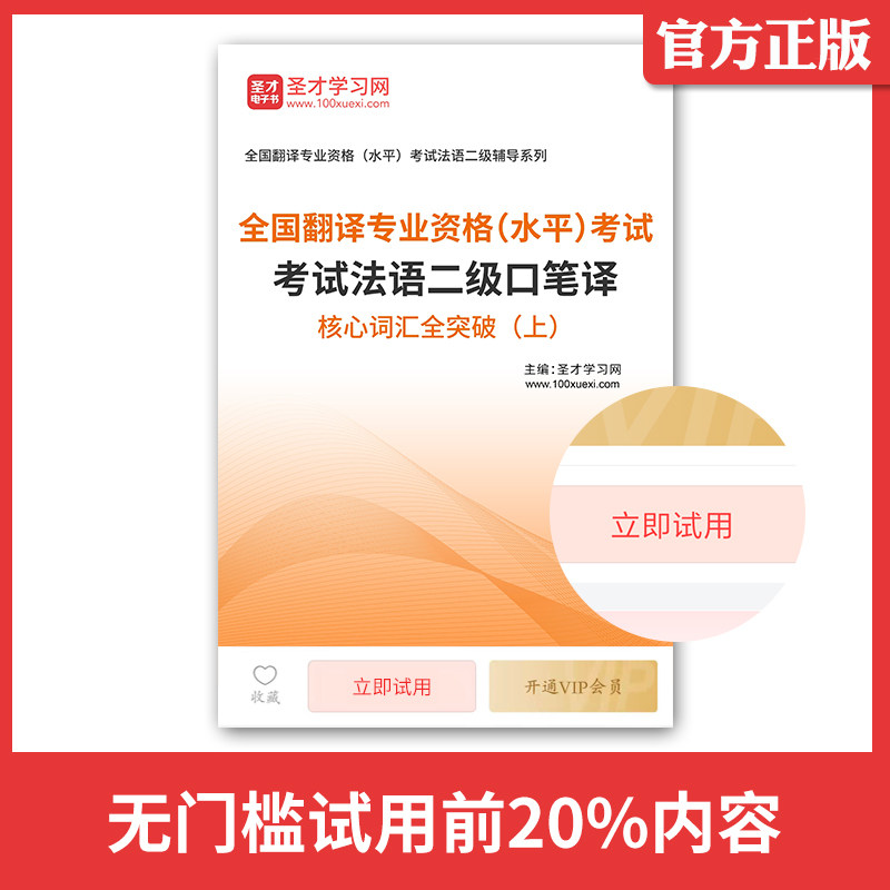 2026年全国翻译专业资格水平考试法语二级口笔译核心高频词汇全突破圣才电子书 商品标签: 发布时间:2026年03月15日 市 场 价:48 元 折 扣 价:48 元 所 在 地:江苏 徐州 店铺掌柜:音之韵图书专营店 去购买>> 下架了的话点我重新搜索 本站来源:淘宝(www.xiuda.net)购物与天猫(www.tianmaocn.com)是一个知名的电商平台,淘宝同时您也可以访问(www.taobwg.com)来发现更多精彩的购物选择。